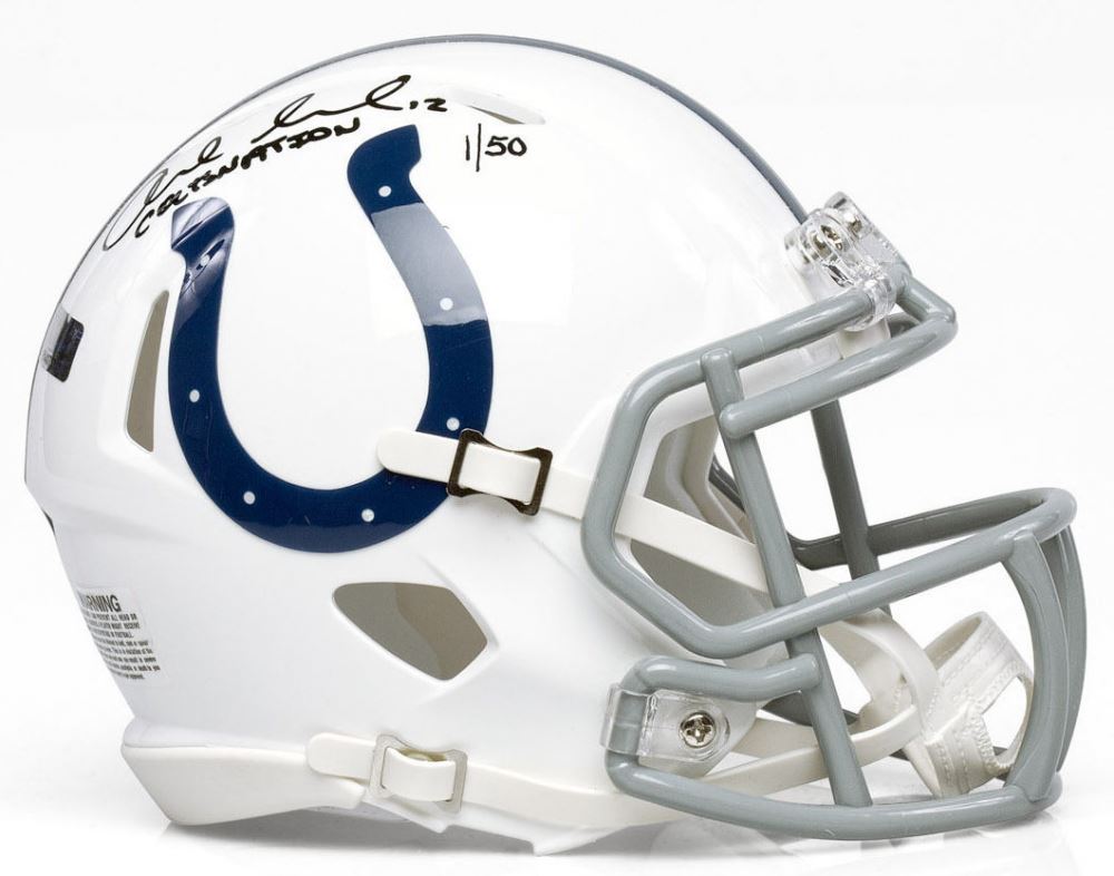 Indianapolis Colts mini helmet. Hand-signed and inscribed in black felt-tip pen by Andrew Luck. The helmet is limited edition and has been hand-numbered #/50.