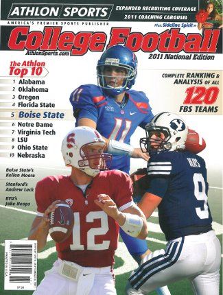 This is an Athlon Sports 2011 NCAA College Football National Magazine with Stanford Cardinal and Boise State Quarterbacks Andrew Luck and Kellen Moore on the cover. This Preview has team analysis, predictions, and more for the 2011 Season