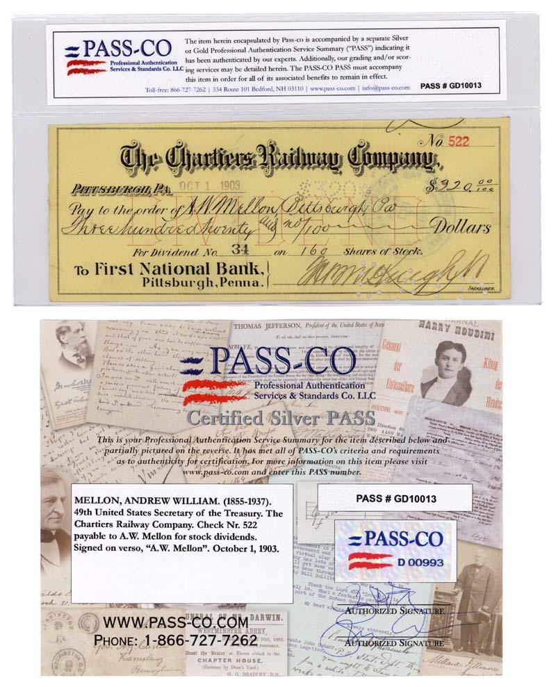 ANDREW MELLON (1855-1937_ Financier and Secretary of the Treasury. Partially Printed check issued to Mellon and endorsed on verso, “ A.W. Mellon.” Pittsburgh, Pennsylvania. October 1, 1903. Light hole cancellations do not affect Mellon’s signature. Extremely Fine. This item has been encapsulated by PASS-CO, LLC. and is accompanied by a Certified Silver PASS.