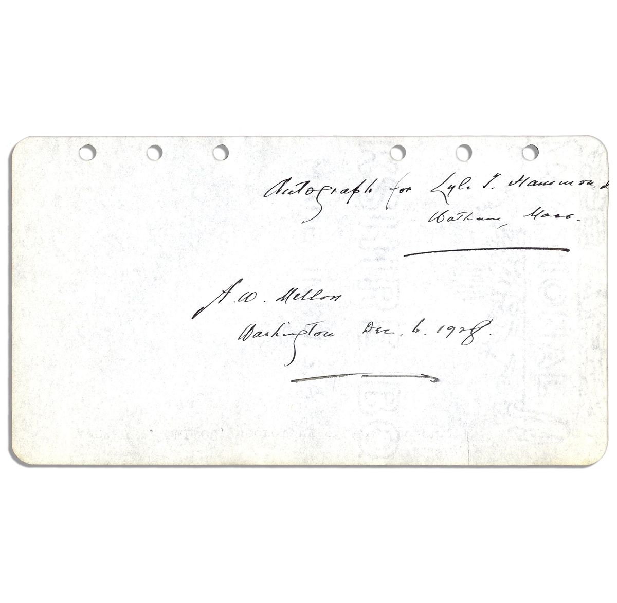 Andrew Mellon's signature as Secretary of the Treasury. The American industrialist's autograph inscription reads: ''Autograph for Lyle T. Hammond / Waltham, Mass. / A.W. Mellon / Washington Dec. 6 1928''. Mellon served a lengthy term as Treasury Secretary from 1921 until 1932; he lowered the national debt from WWI while cutting taxes before the onset of the Great Depression. Measures 6.75'' x 3.75''. Near fine.