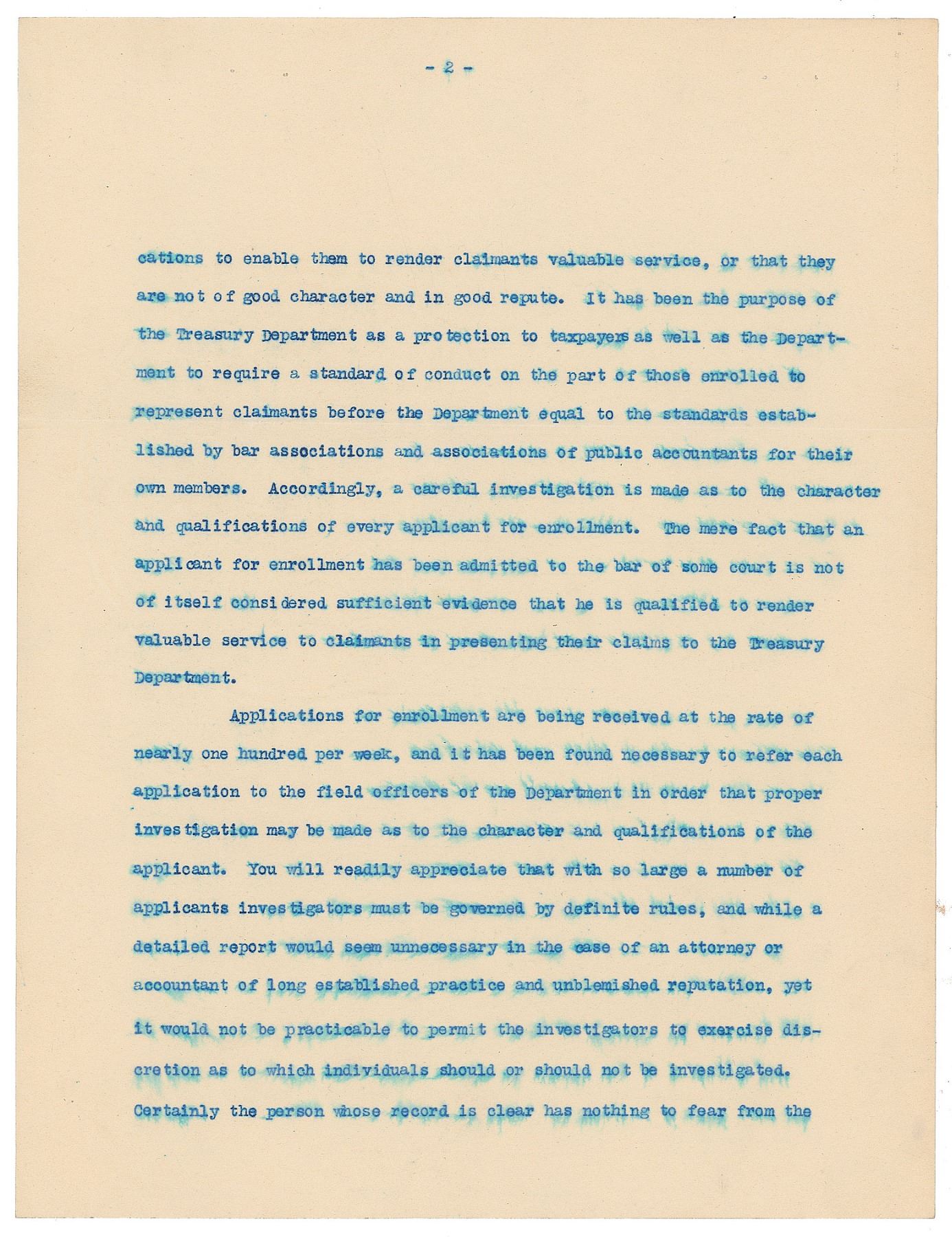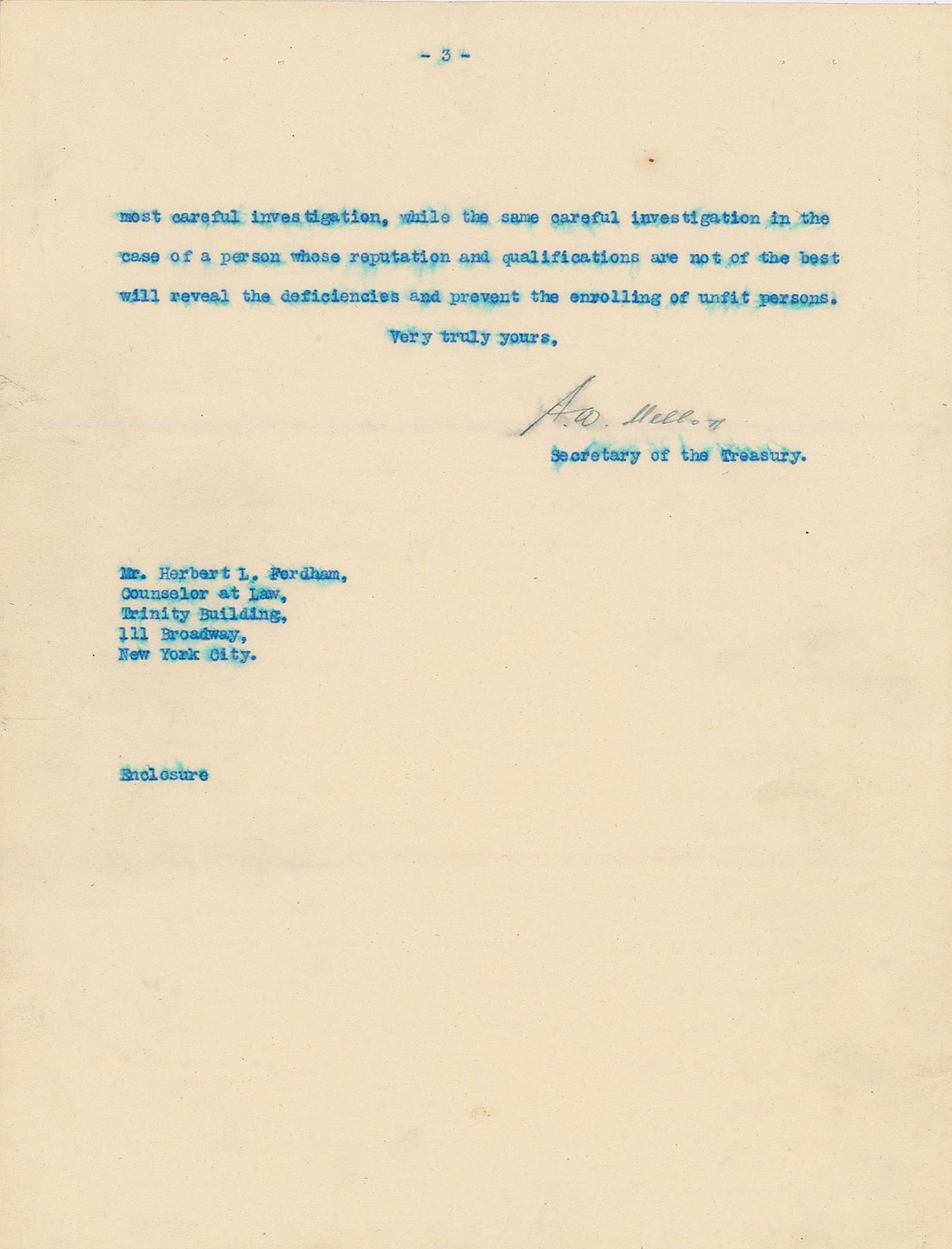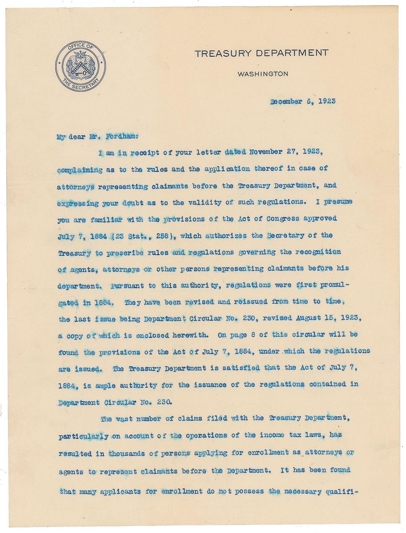 TLS, three pages, 8 x 10.5, Treasury Department letterhead, December 6, 1923. Lengthy letter to attorney Herbert L. Fordham, responding to his complaint regarding the application process required to represent claimants before the Treasury Department, in part: "The vast number of claims filed with the Treasury Department, particularly on account of the operations of the income tax laws, has resulted in thousands of persons applying for enrollment as attorneys or agents to represent claimants before the Department. It has been found that many applicants for enrollment do not possess the necessary qualifications to enable them to render claimants valuable service, or that they are not of good character and in good repute." In fine condition, with light blotting to the signature, and to much of the type. Accompanied by a copy of Fordham's original letter.