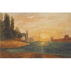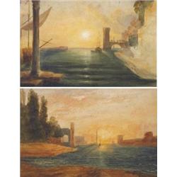 Andrew Nicholl RHA (1804-1886) SEA PORT AT SUNSET, AFTER CLAUDE inscribed on mount watercolour on paper (2) 23 by 36cm., 9.25 by 14in. Provenance: By descent to the previous owner; Private collection, Co. Dublin A copy after a work by Claude Lorraine, formerly in the collection of the National Gallery in London. With a second work, unfinished, of another maritime scene by Claude (12.5 x 16 inches).