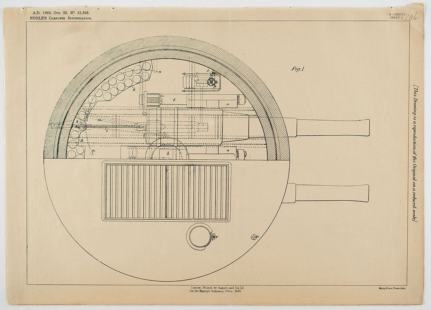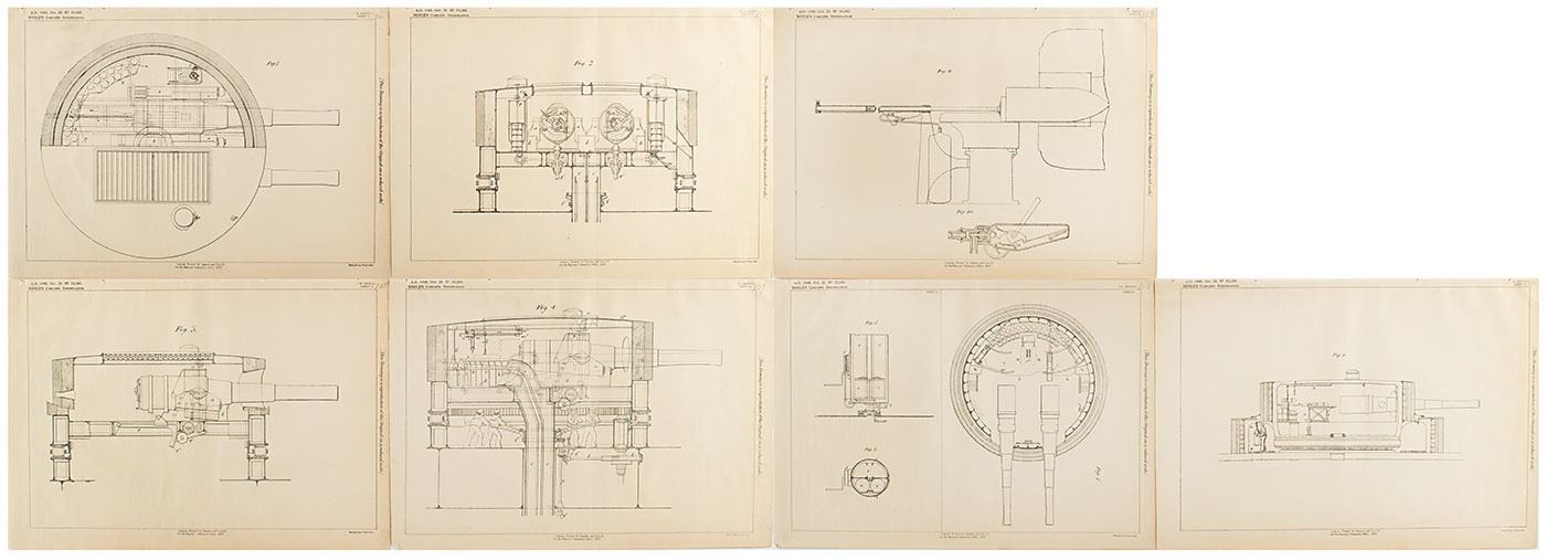 Original linen-backed patent lithographs for Andrew Noble's system of mounting guns on turrets, seven pages, 14.25 x 10, October 25, 1888. The detailed diagrams show the turret system from several angles, as well as its proposed operation by soldiers. The top borders read: "A.D. 1888. Oct. 25. No. 15,396. Noble's Complete Specification." The lower borders feature the printed text: "London. Printed by Darling and Son Ltd. for Her Majesty's Stationery Office. 1889" and "Malby & Sons, Photo-Litho." The right borders read: "This Drawing is a reproduction of the Original on a reduced scale." In fine condition.