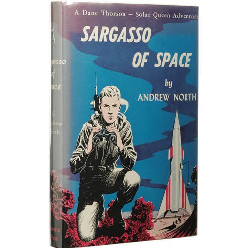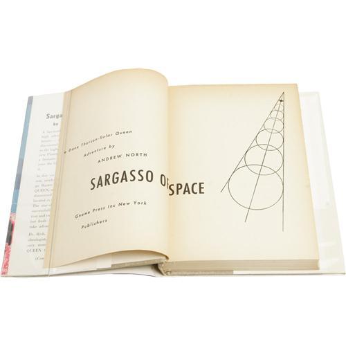 <B>Andrew North Andre Norton :<I> Sargasso of Space.</B></I></B></I> (New York: Gnome Press, 1955), first edition (second state), 185 pages, tan boards with black titles, cover illustrated by Ed Emsh, 8vo (5.75" x 8.75"), ultra light spotting to boards, pages are toned due to cheap paper stock (as was common with Gnome books), dust jacket unclipped and bright except light fading to spine, else near fine. Andrew North is the pseudonym of Andre Norton. <I>From the Ventura Collection.</B></I><BR><BR><b>Shipping:</b> Books & Catalogs (<a target="_blank" href="http://www.heritageauctions.com/common/shipping.php">view shipping information</a>) <BR><BR><B>Important notice:</