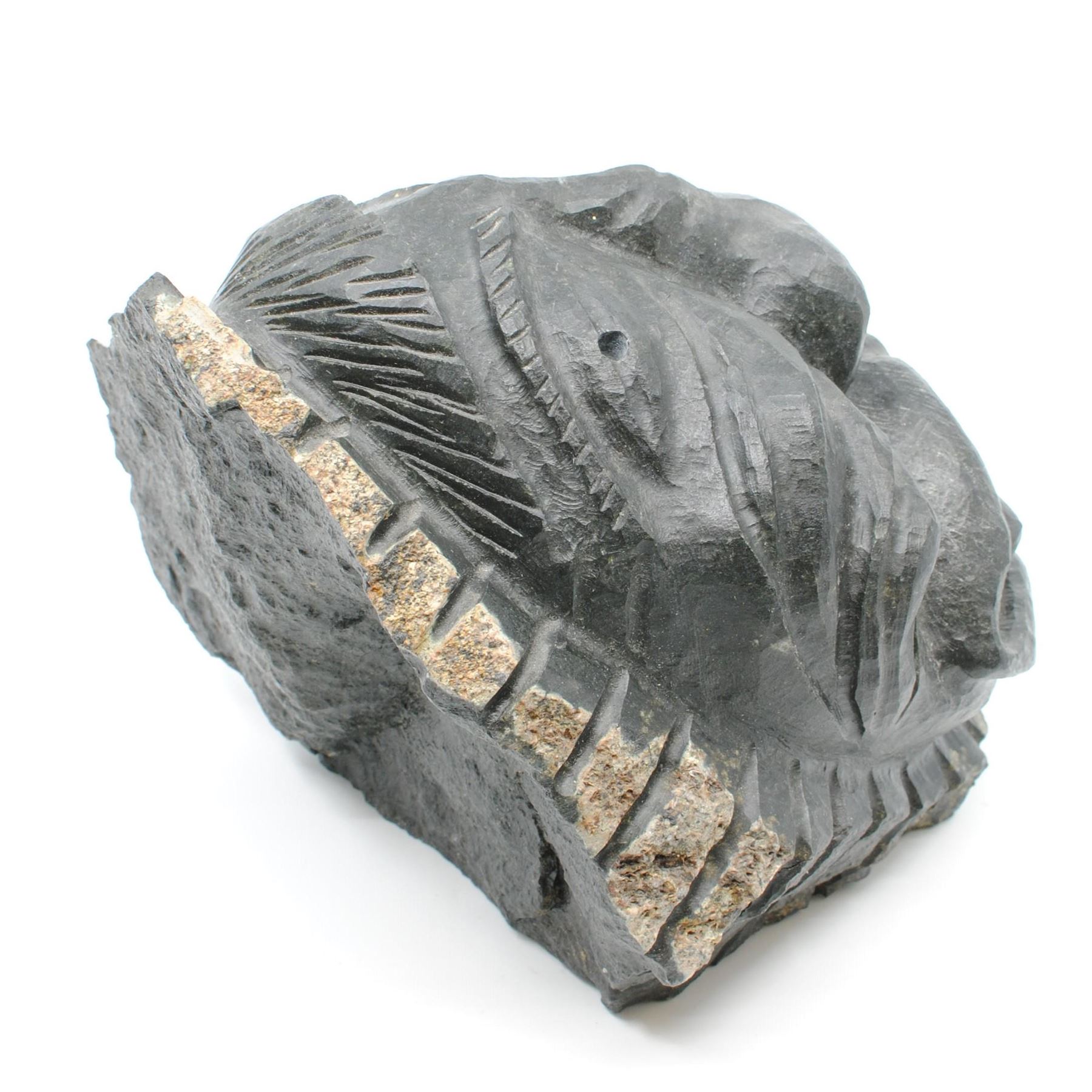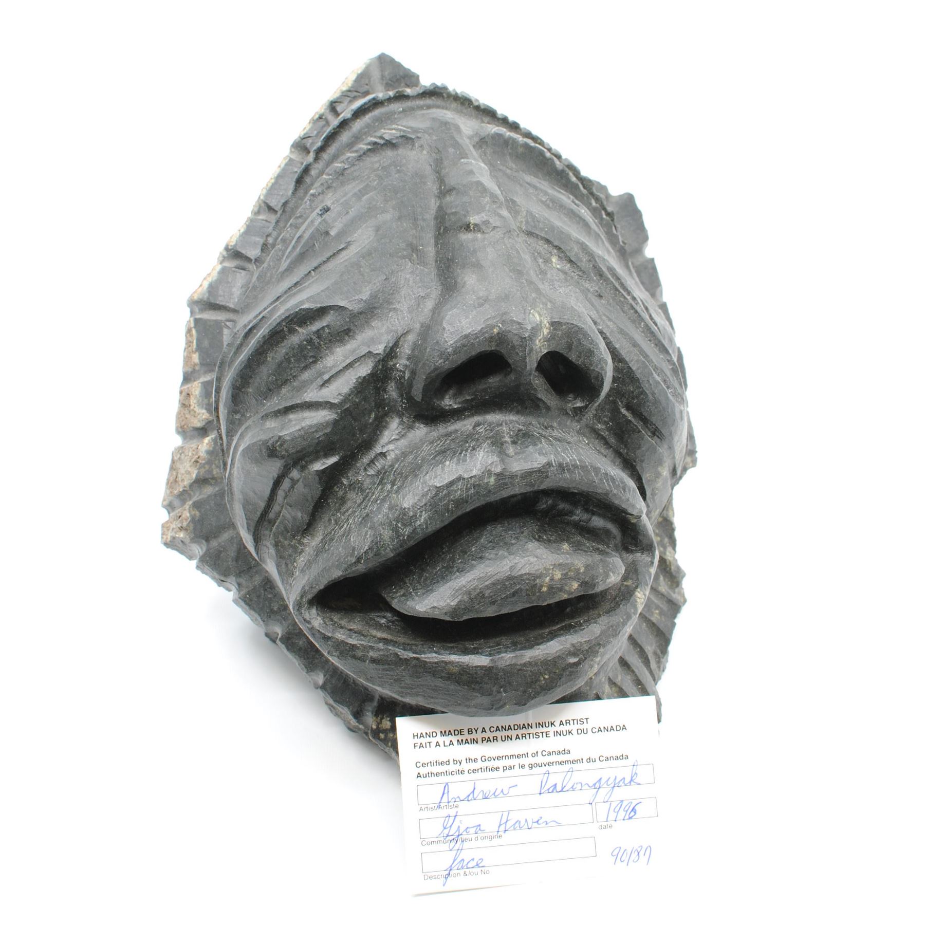 Andrew Palongyak's "Face" original Inuit carving. Carved in 1996, from the community of Gjoa Haven. Carved fom stone, and certified by the government of Canada. This carving is in excellent condition. Included with its certification tag. 8" x 7 1/2" x 6 1/2"