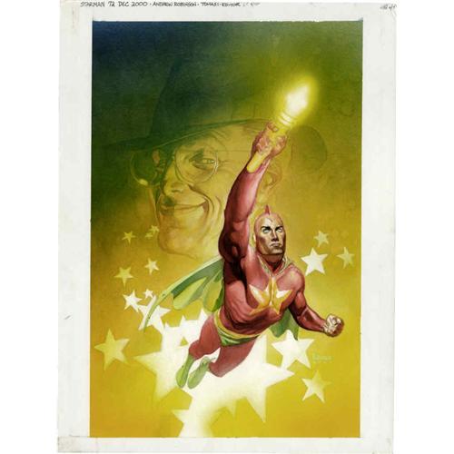 <B>Andrew Robinson - Starman #72 Cover Original Art (DC, 2000).</B></I> It's better to burn out, than fade away! This breathtaking, full-color celebration of Golden Age gallantry covered the milestone <B>Starman</B></I> #72, the interior of which featured the death of the original Starman. A remarkable hand-painted cover illustration by Andrew Robinson, drawn eight issues before the series' end! The image area measures 12" x 18.5", and, aside from some slight soiling around the cape and boots, the condition is Excellent.