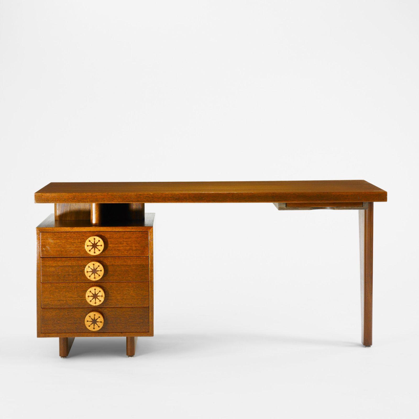 Desk features four drawers and one pull-out writing surface.