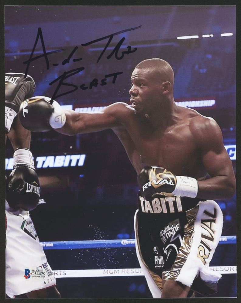 Photo measures 8" x 10" and has been hand-signed and inscribed in black felt-tip pen by Andrew Tabiti.