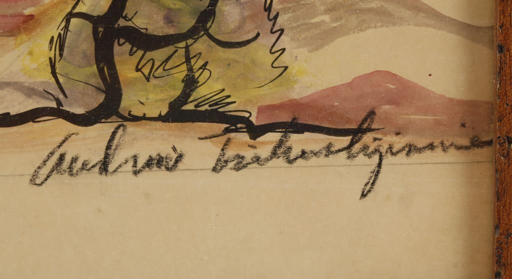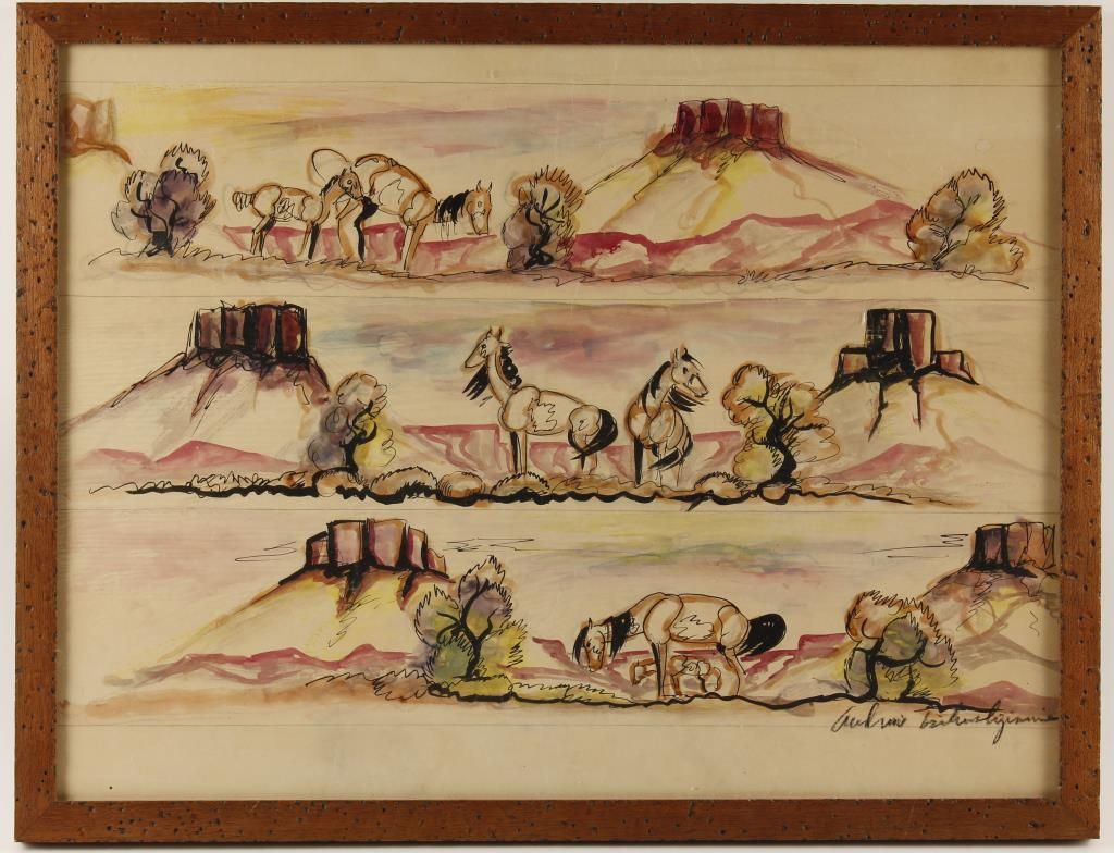 Original framed watercolor. 25" by 19-1/4" overall. Depicting a southwest scene, hand signed by Tsihnnahjinnie a well known indian artist.