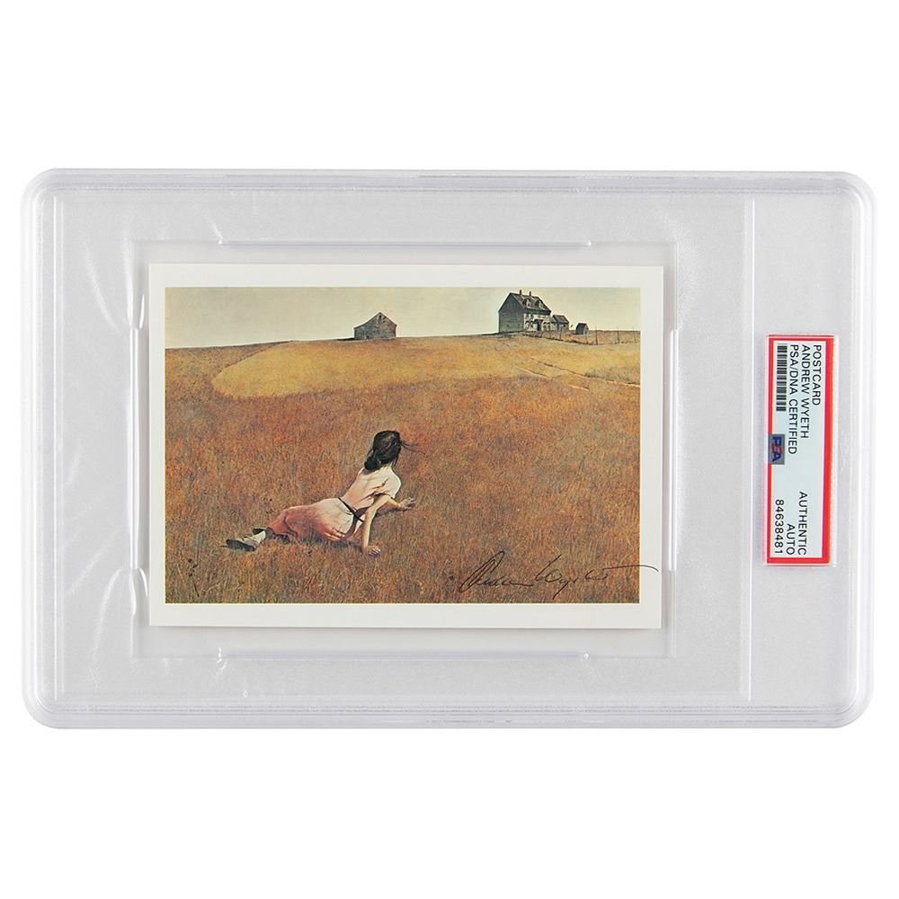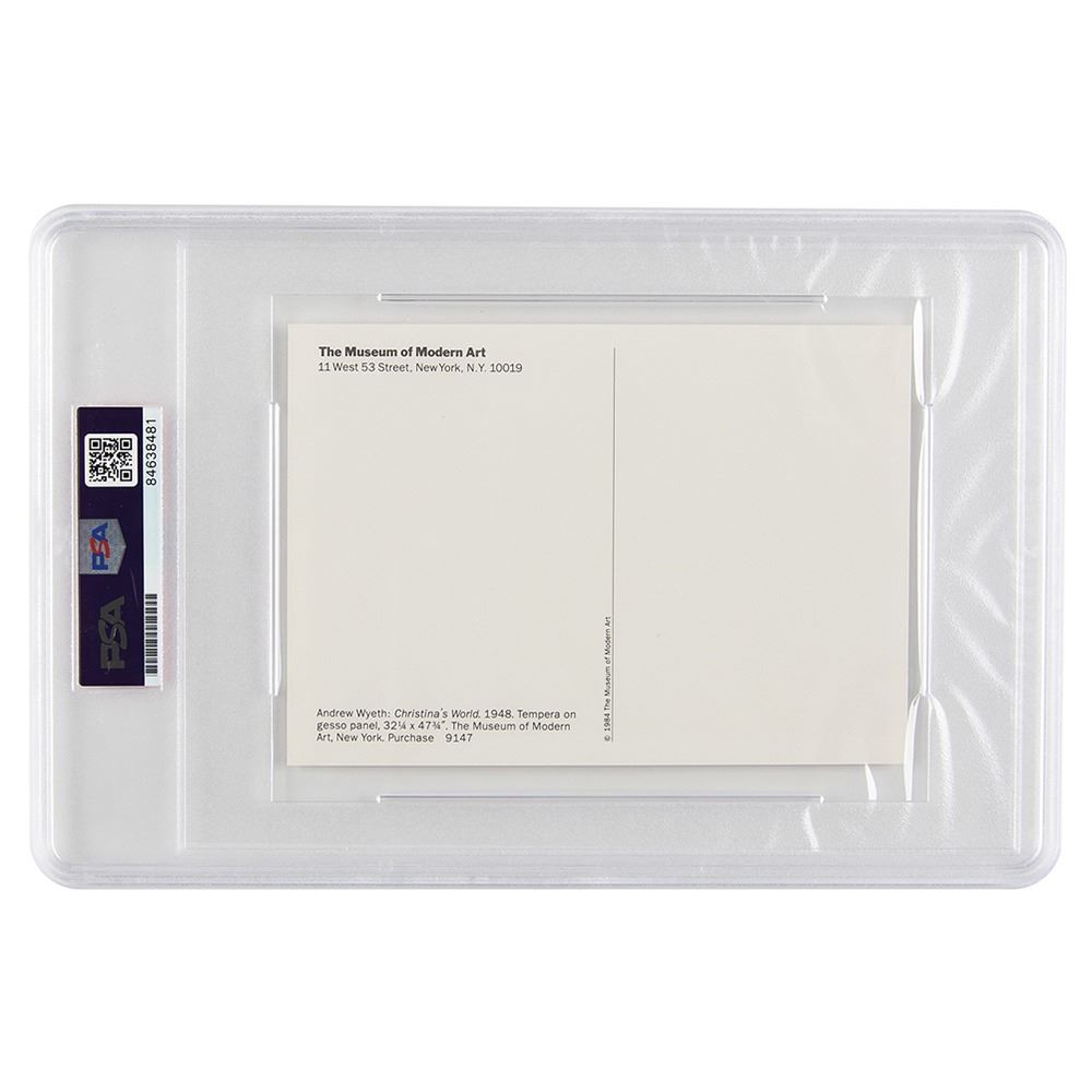 Very desirable color semi-glossy 6 x 4.25 MOMA postcard featuring Andrew Wyeth's 1948 masterpiece 'Christina's World,' signed in the lower right in ballpoint by the artist. In very fine condition. Encapsulated in a PSA/DNA authentication holder.