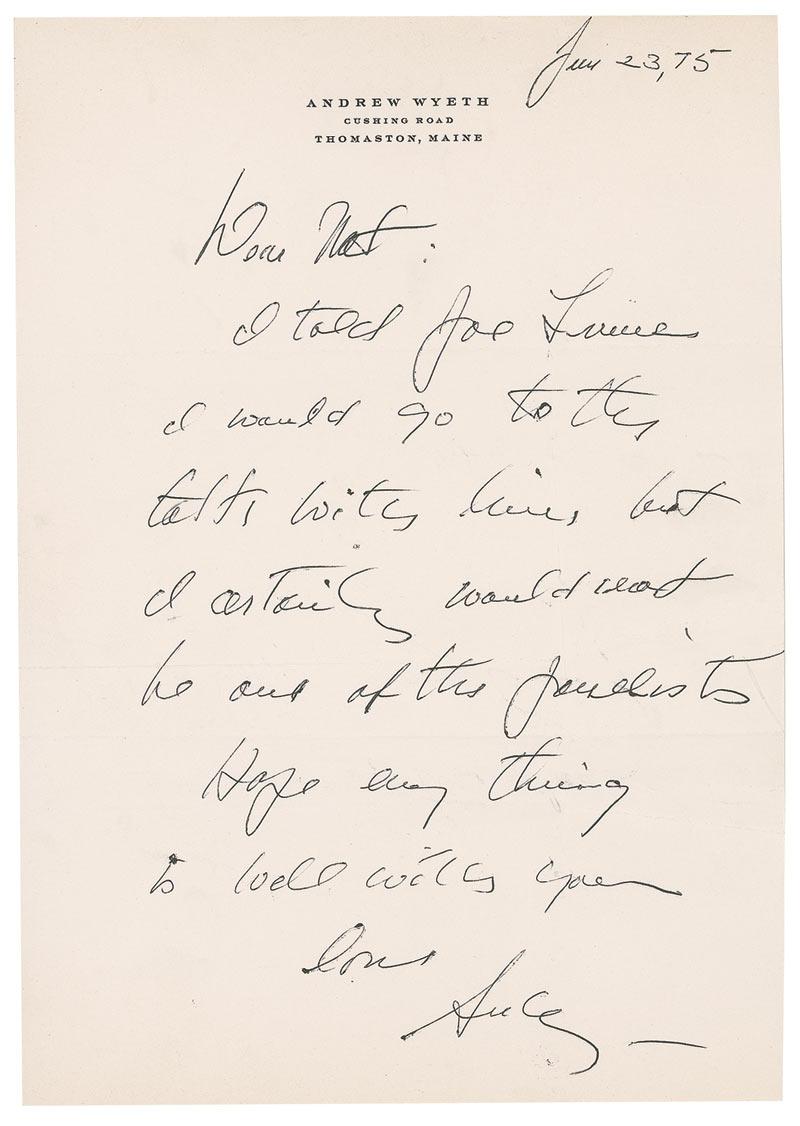 Esteemed American painter (1917–2009) best known for his distinctively realist scenes of New England and his native Pennsylvania. ALS signed “Andy,” one page, 7.25 x 10.25, June 23, 1975. Wyeth wrote “Nat” about upcoming plans. In full: “I told Joe Louis I would go to the talk with him, but I certainly would not be one of the panelists. Hope everything is well with you.” Creasing and intersecting folds, one vertical fold passing through the end of his name, otherwise fine condition.