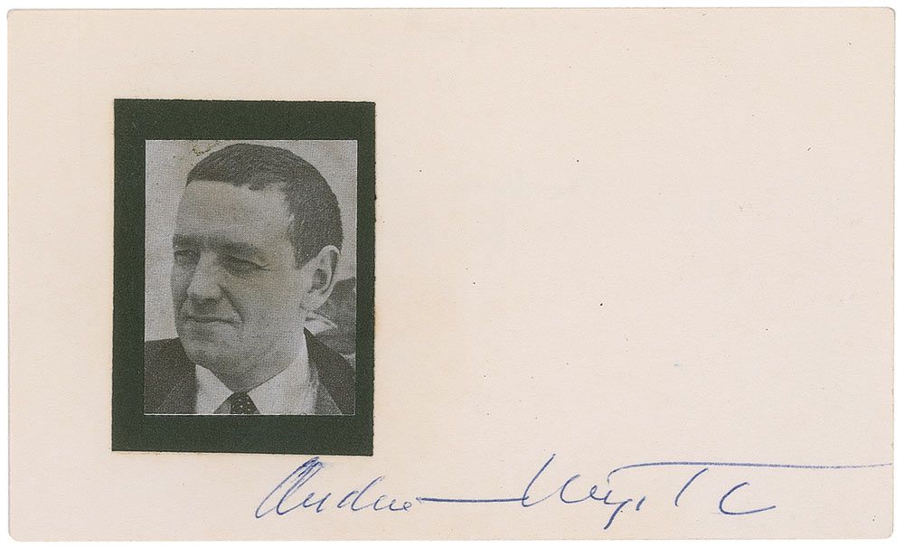 Esteemed American painter (1917–2009) best known for his distinctively realist scenes of New England and his native Pennsylvania. Ballpoint signature, “Andrew Wyeth,” on an off-white 5 x 3 card, with a clipped photo affixed above signature. In fine condition.