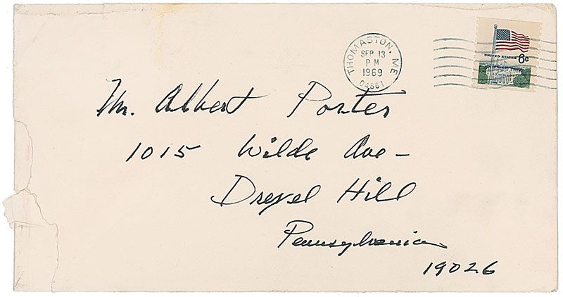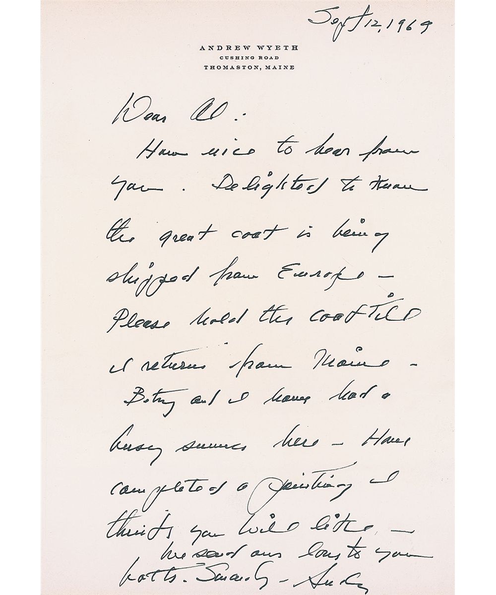 ALS signed “Andy,” one page, 7.25 x 10.25, personal letterhead, September 12, 1969. Letter to a friend. In part: “Delighted to know the great coat is being shipped from Europe—please hold the coat till I return from Maine…Have completed a painting I think you will like.” In fine condition. Consignor notes that the painting referred to is ‘The Virgin,’ a full-length nude of Siri Erickson. Accompanied by the original mailing envelope, filled out in Wyeth’s hand, and an original color snapshot photo of Wyeth wearing the coat he refers to in the letter, as well as a photocopied letter of provenance from a gentleman whose father was a friend of Wyeth’s and had the coat ordered from Europe.