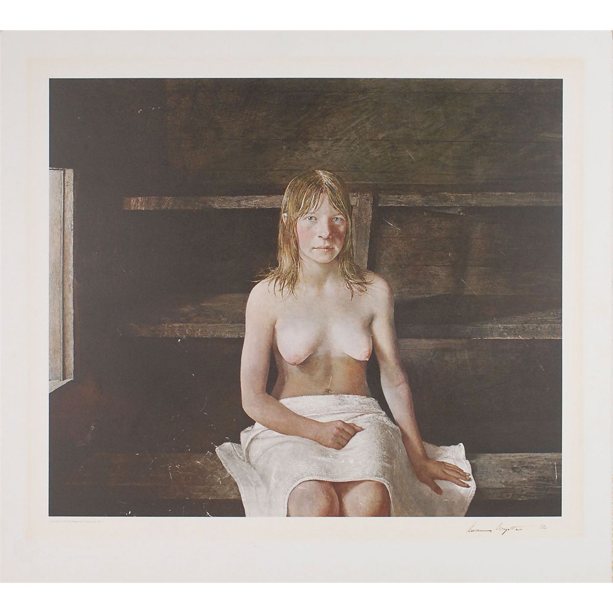 Color 27.5 x 25 lithograph entitled ‘The Sauna,’ signed in the lower border in black ink. In fine condition, with uniform toning around edges of image from previous display. Originally done in 1968, this was Wyeth’s first series of nudes. Siri was a young girl who lived in a rural area of Maine. With her parents' permission, Wyeth began painting her first clothed, then partially clothed, then in the nude when she was 14 years old.