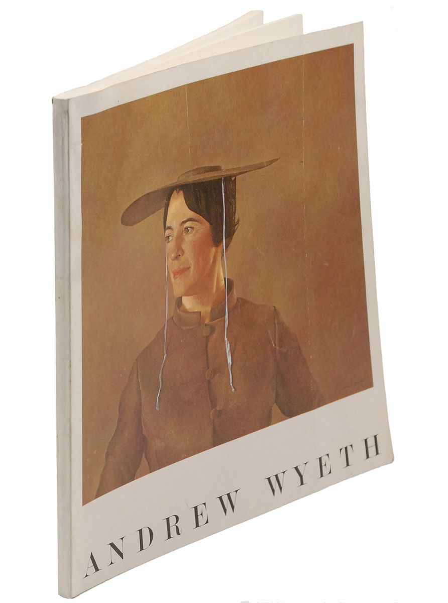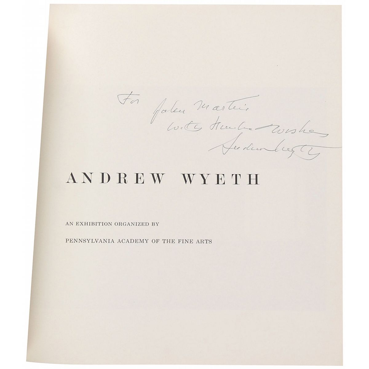 Softcover exhibition catalog from his 1966 show organized by the Pennsylvania Academy of the Fine Arts, published by Abercrombie & Fitch Co. of New York, 9.5 x 10, 111 pages, signed and inscribed on the title page in black ballpoint, “To Jake Martins, With sincere best wishes, Andrew Wyeth.” Creasing to the front cover and a tear to the top of the back cover, otherwise fine condition.