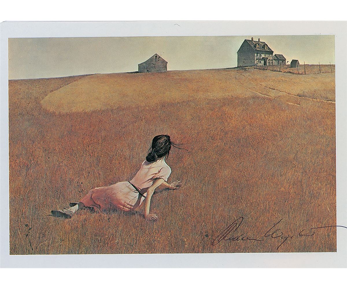 Color MOMA postcard depicting Wyeth’s 1948 masterpiece ‘Christina’s World,’ 6 x 4.25, signed in the lower right in ballpoint, “Andrew Wyeth.” In very fine condition.