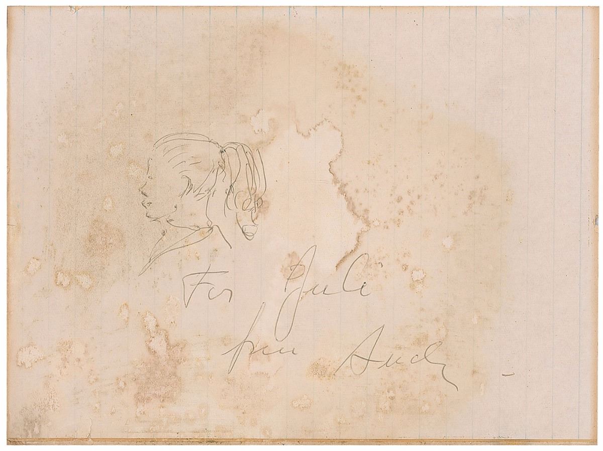 Original pencil sketch of a young girl in profile accomplished by Wyeth on an off-white 7.75 x 5.75 sheet, signed and inscribed below, “For Juli, from Andy.” Affixed to a same-size mount. Foxing and soiling affecting the overall appearance, otherwise very good condition. Accompanied by a letter of provenance from the original recipient, “Juli,” in part: “This is an original pencil drawing by Andrew Wyeth. It was drawn for me in 1969. The picture is of me with my famous ponytail…I remember the day Andy did this for me…We were sitting at the kitchen table at our summer cottage on Broad Cove in Cushing, Maine, (across the cove from the Wyeth’s summer home)…I always thought of Andy as that funny guy, who walked with a bit of a limp, had a great smile and was a bit quirky. He was wonderful. We hung out with the Wyeth family quite often.” A desirable original sketch with a charming personal backstory.
