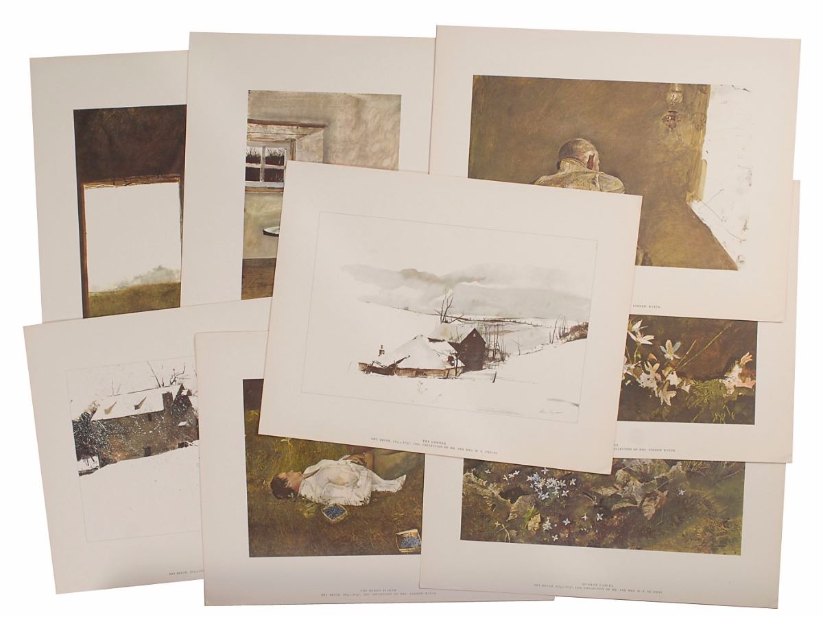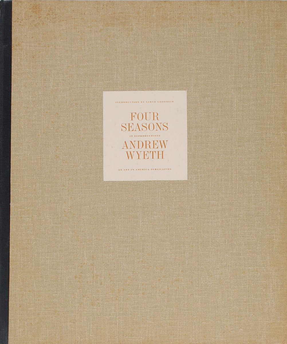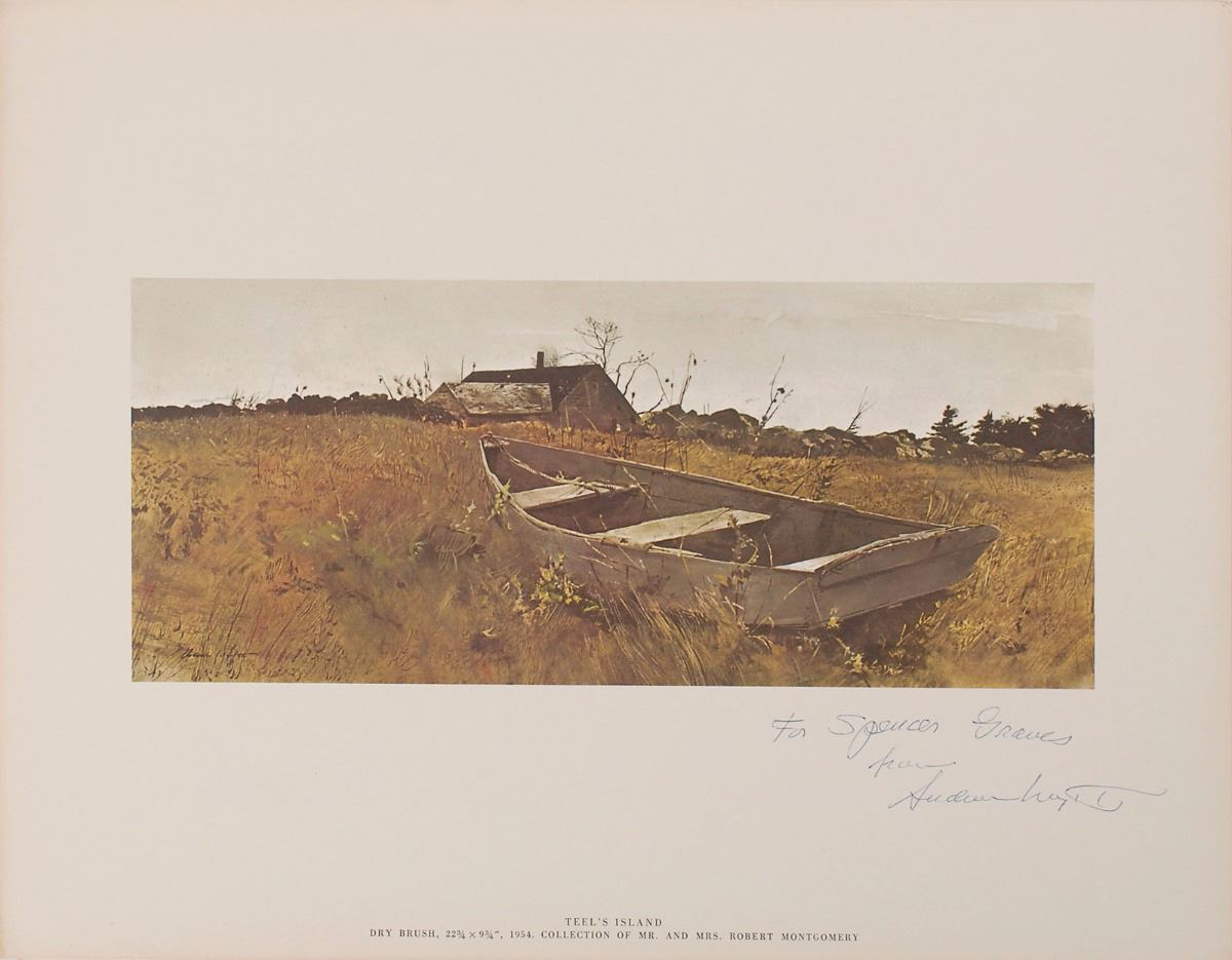 Handsome color 17 x 13.25 print entitled ‘Teel’s Island’ from Wyeth’s 1962 Four Seasons portfolio, signed and inscribed in the lower border in ballpoint, “For Spencer Graves, from Andrew Wyeth.” In fine condition, with trivial toning to edges. Accompanied by the hardcover portfolio, cover sheet, and eight additional unsigned color prints originally issued with the set.
