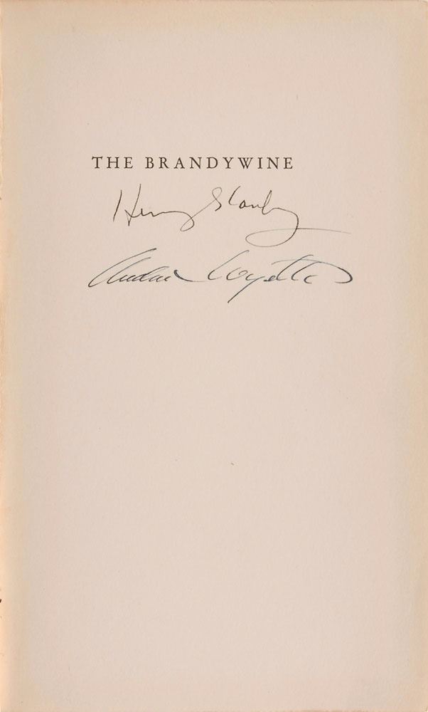 Signed book: The Brandywine. Second large printing. NY: Farrar & Rinehart, 1941. Hardcover with dust jacket, 5.5 x 8.25, 285 pages. Boldly signed on the half-title page in fountain pen by the author, "Henry S. Canby," and illustrator, "Andrew Wyeth." In very good to fine condition, with cracked hinges and wear to price-clipped dust jacket.