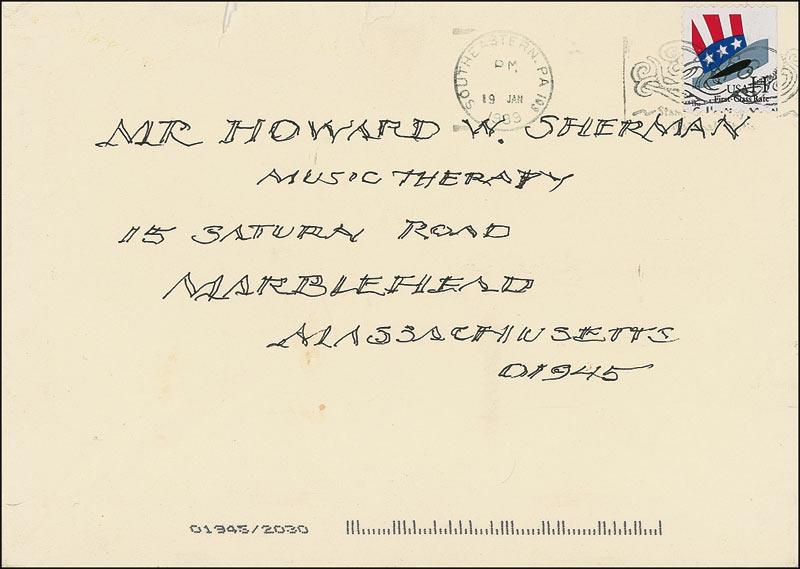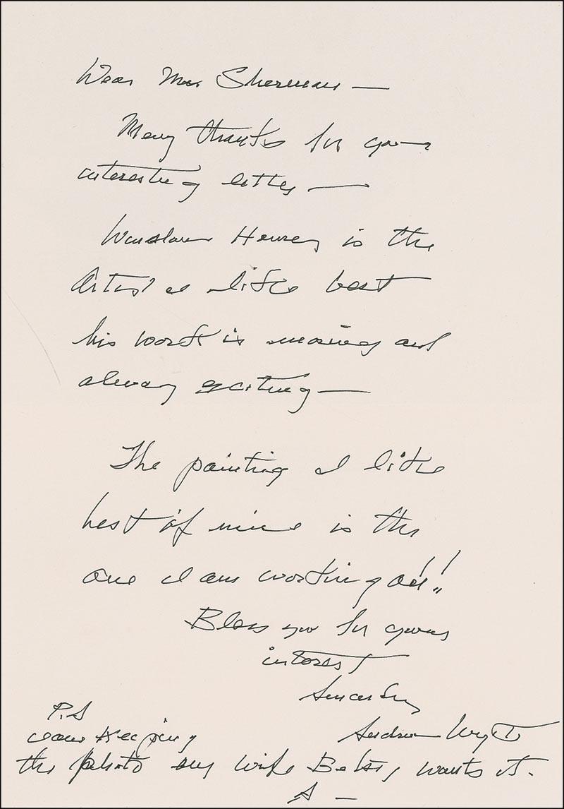 ALS written on the inside of a 7 x 5 greeting card bearing one of his works. In full: “Many thanks for your interesting letter—Winslow Homer is the artist I like best. His work is moving and always exciting—The painting I like best of mine is the one I am working on! Bless you for your interest.” He has added the postscript: “I am keeping the photo, my wife Betsy wants it. A—” According to the consignor, he sent Wyeth a photo asking him to sign it, but as noted, the artist’s wife opted to keep it for herself. In fine condition. Accompanied by the original mailing envelope, postmarked January 19, 1989, and addressed by Wyeth in an artistically elaborate fashion.