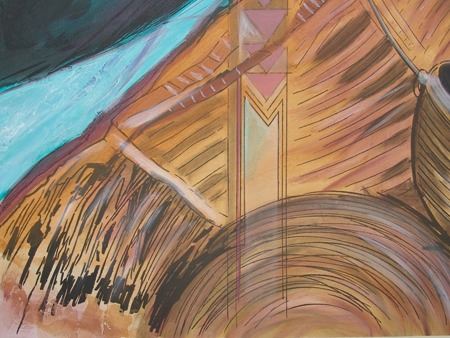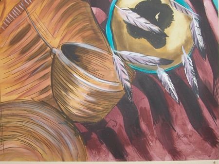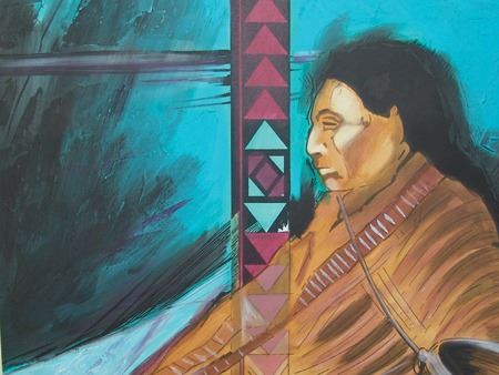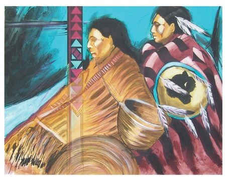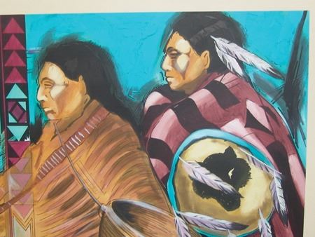 Early 2000s, Large and colorful signed original acrylic on canvas depicting two Native subjects in profile. Very good condition. 36" x 46" (42-1/4" x 52-1/4" framed)