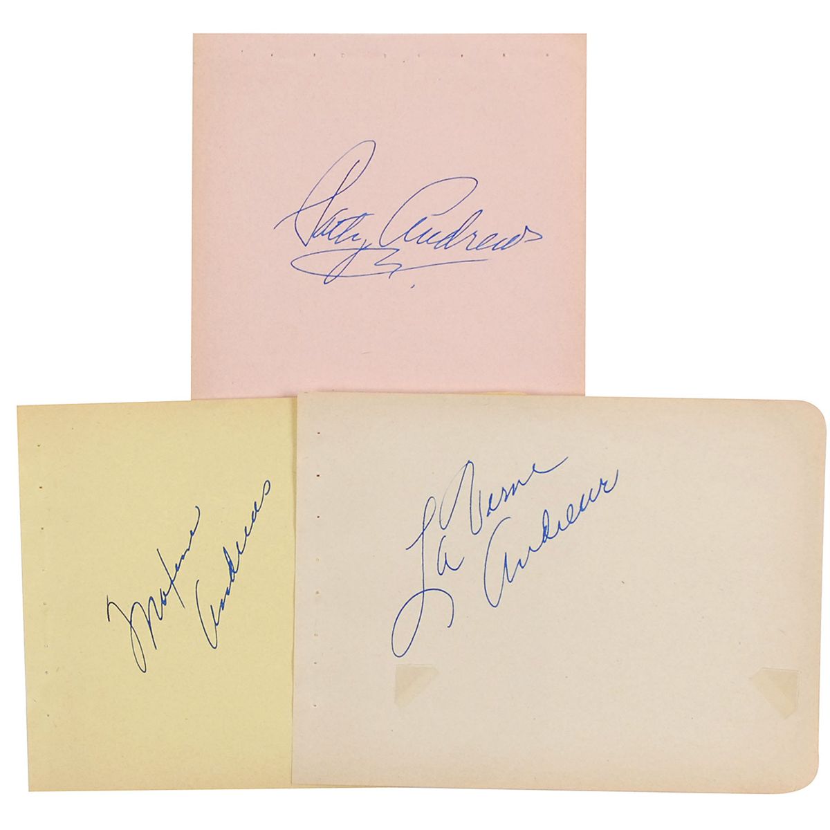 Vintage fountain pen signatures of Patty, Maxine, and LaVerne Andrews on individual 6 x 4.5 colored album pages. In fine condition.