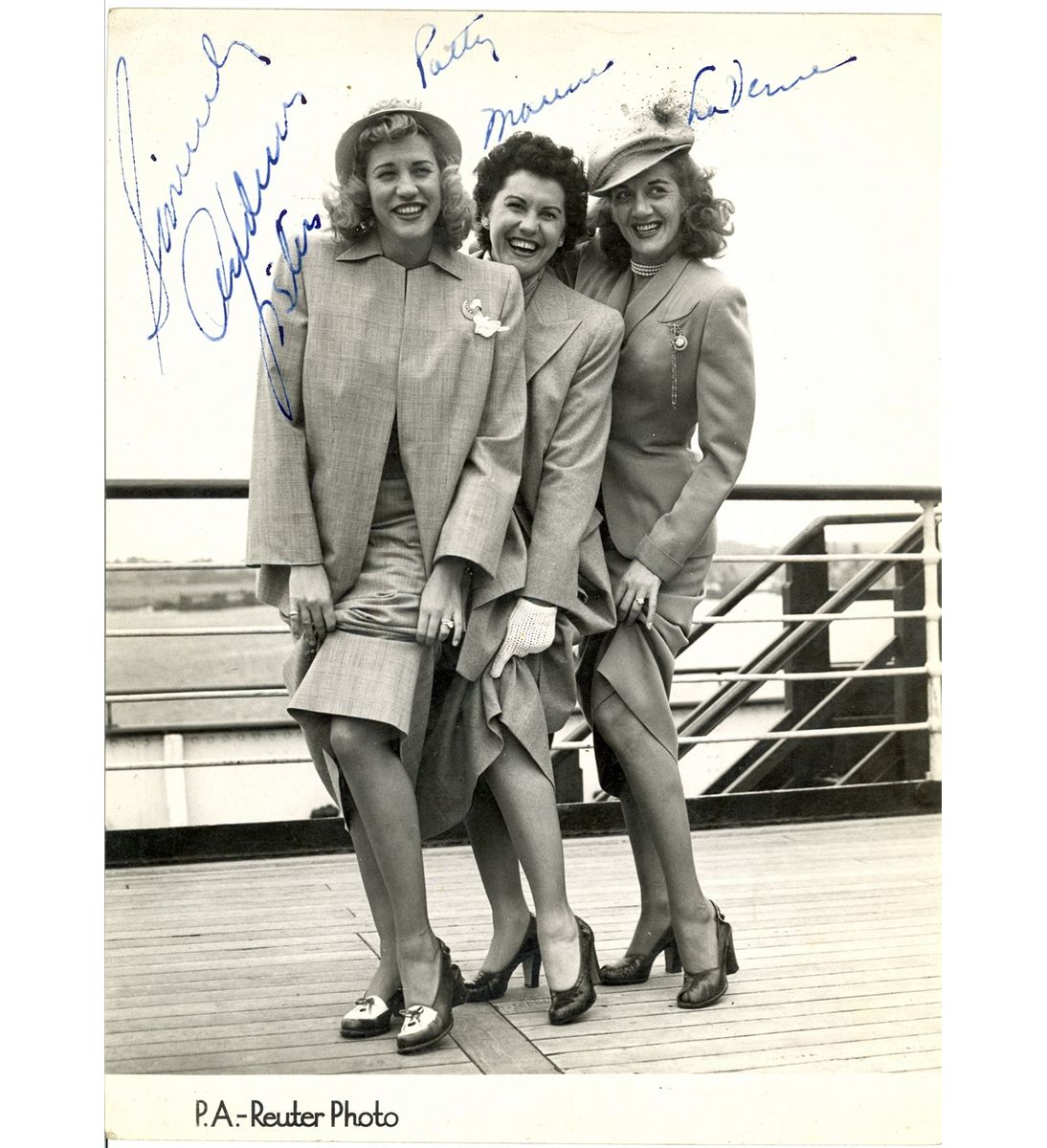 Vintage glossy 5 x 7vintage group photo, signed and inscribed in fountain pen, “ Sincerely, Andrews Sisters,” and signed by Patty, Maxene, and LaVerne. In fine condition.