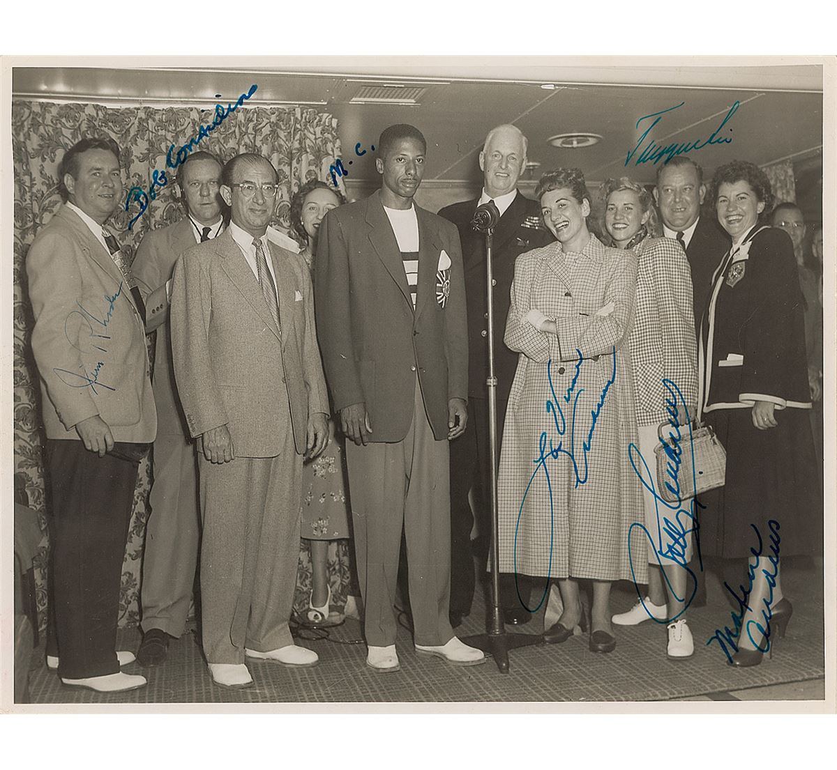 Vintage glossy 9.5 x 7.5 photo of a diverse diplomatic meeting, signed in fountain pen by LaVerne Andrews, Patty Andrews, and Maxene Andrews, as well as Norwegian politician Trygve Lie, writer Bob Considine, American politician Jim Rhodes, and one other. Scattered creases and trimmed edges, otherwise fine condition. Lie served as the first secretary-general of the United Nations, holding the post from 1946 to 1952