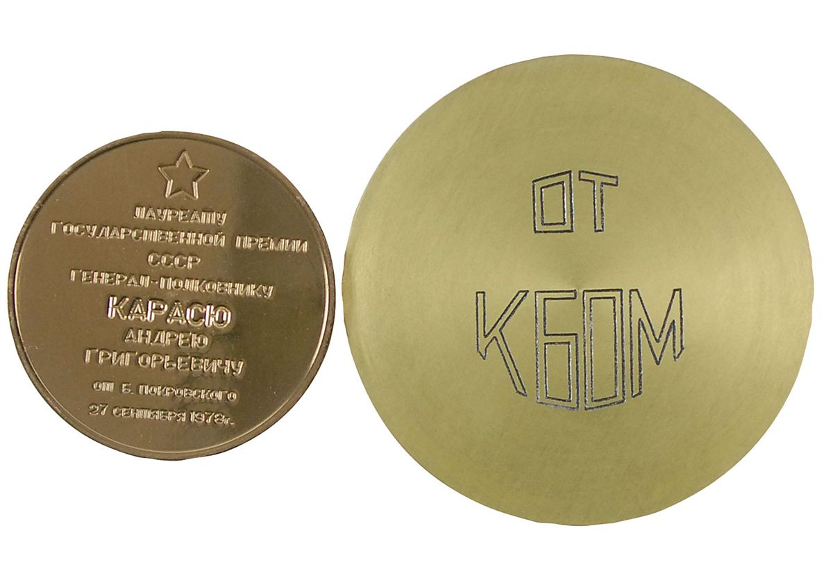 —A large and attractive, one-of-a-kind, hand-painted porcelain vase, which illustrates the history of his service from artillery officer, to the general of the Soviet Air Forces and commander of the Space Troops. It features a portrait of Karas, painted images of satellites, rockets, missile trucks, an artillery cannon, and the Apollo-Soyuz mission, along with a presentation that reads (translated): “To respected Andrey Grigoryevich on the day of his jubilee from the personnel.” This vase most likely originates from the staff of the Baikonur Cosmodrome.