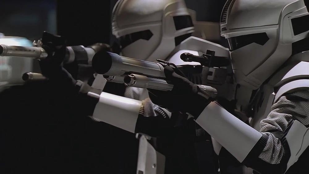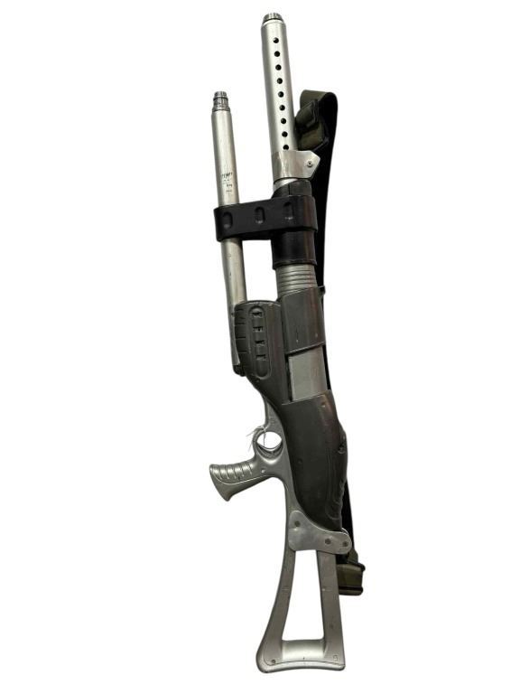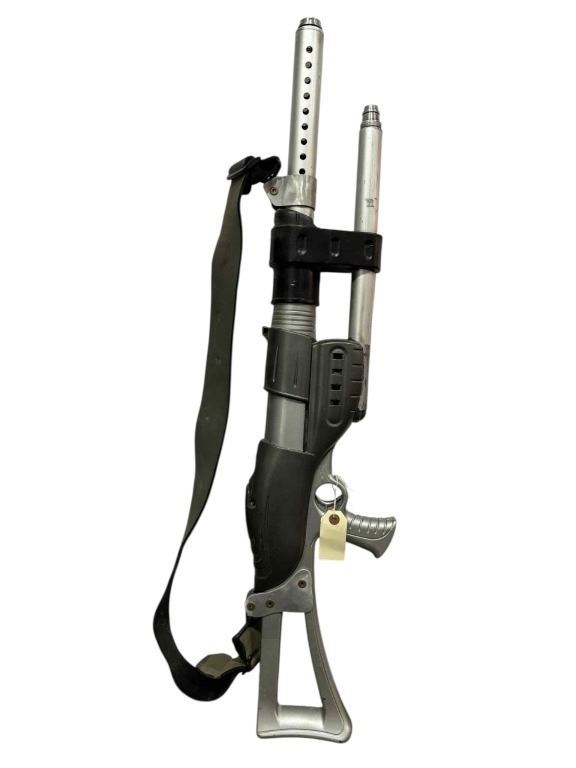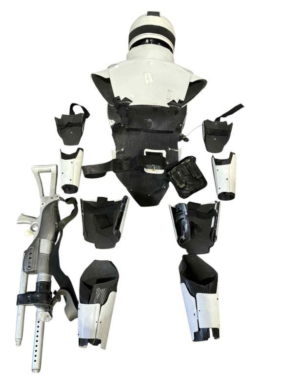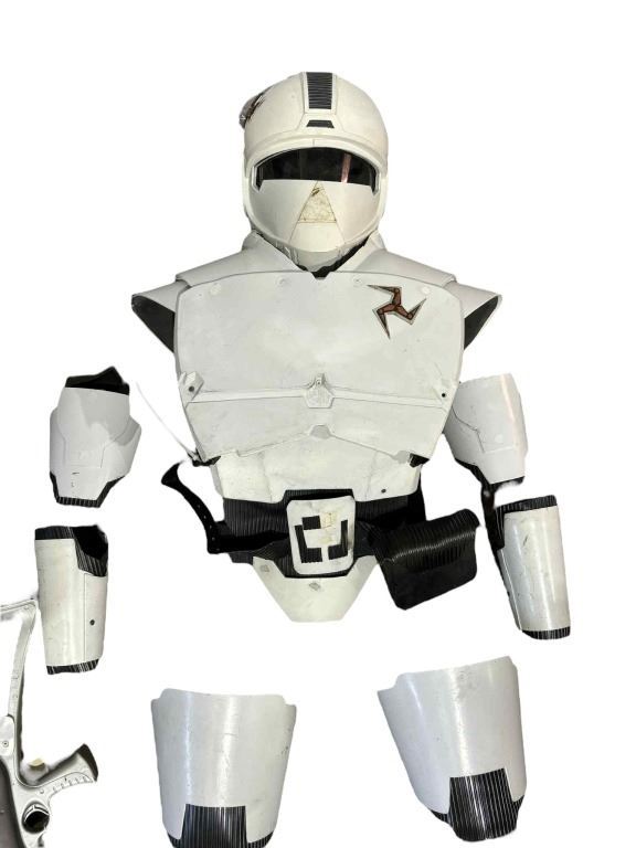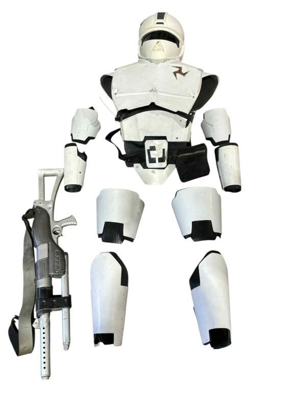Original armor costume worn by a Knight of Gentic Purity along with a phaser rifle used in the production of the science fiction television series 'Andromeda' (2000 - 2005), based on unused material by Gene Roddenberry, developed by Robert Hewitt Wolfe, and produced by Roddenberry's widow, Majel Barrett.