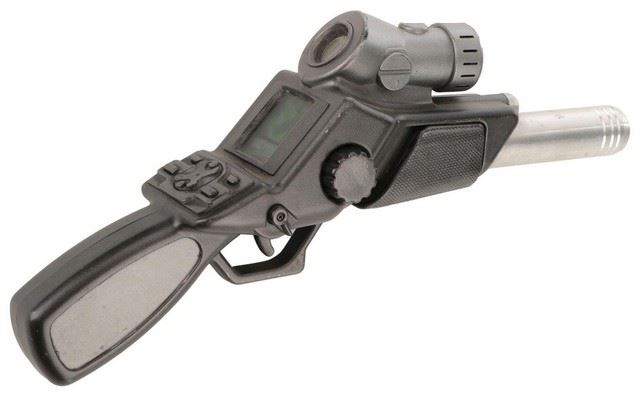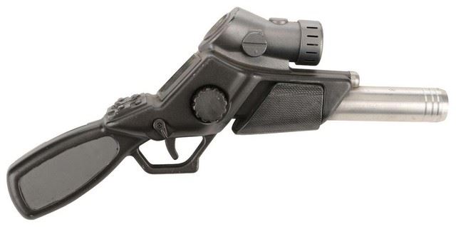 Andromeda TV series hero prop blaster (Sci Fi, 2000-2005) - Original cast resin hand blaster prop with aluminum barrel, moving loader and trigger, depressible buttons on key pad beneath LCD display with scrolling graphic, movable by wheel on right side of screen, and locking safety button, expertly studio painted in silver and gray, measuring 14 x 5.5 x 3.5 in. In very good condition.