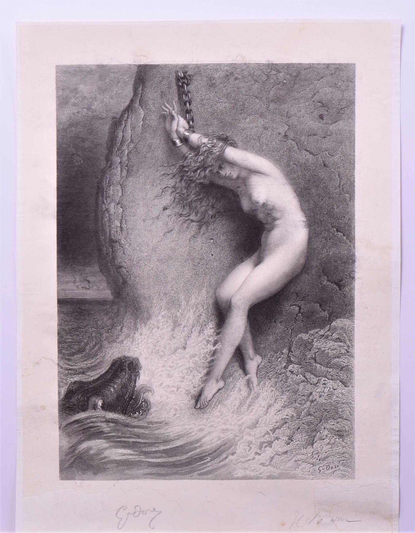 "Andromeda chained to the rock" Signed by Gustave Dore & Herbert Bourne Date: 1869 Image size 12" x 16 3/4" Restored to remove foxing and re-laid on archive backing.