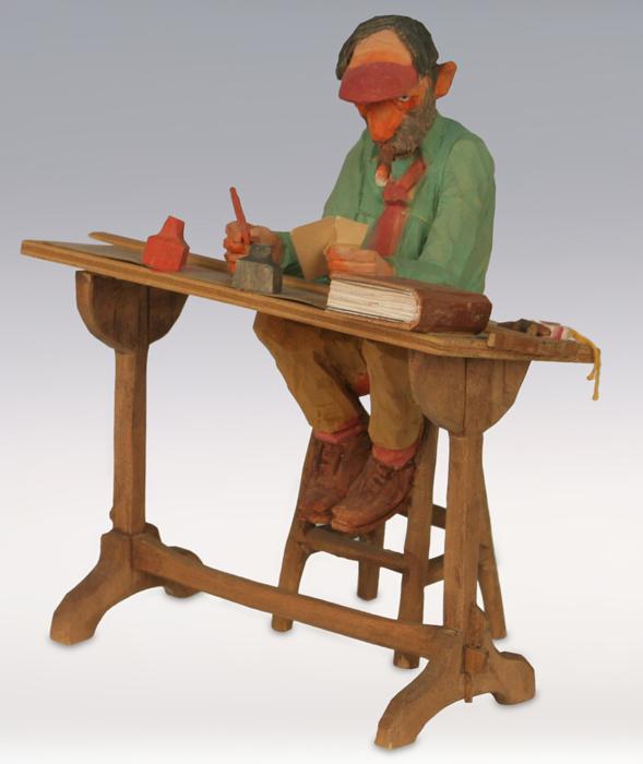Andy Anderson (1893-1960) Wood Carving. The Architect. 11" x 9" x 6 1/2". Featured on page 28, The World of Andy Anderson by High Noon Western Americana. Book is included in lot. Condition Report: Fine condition.