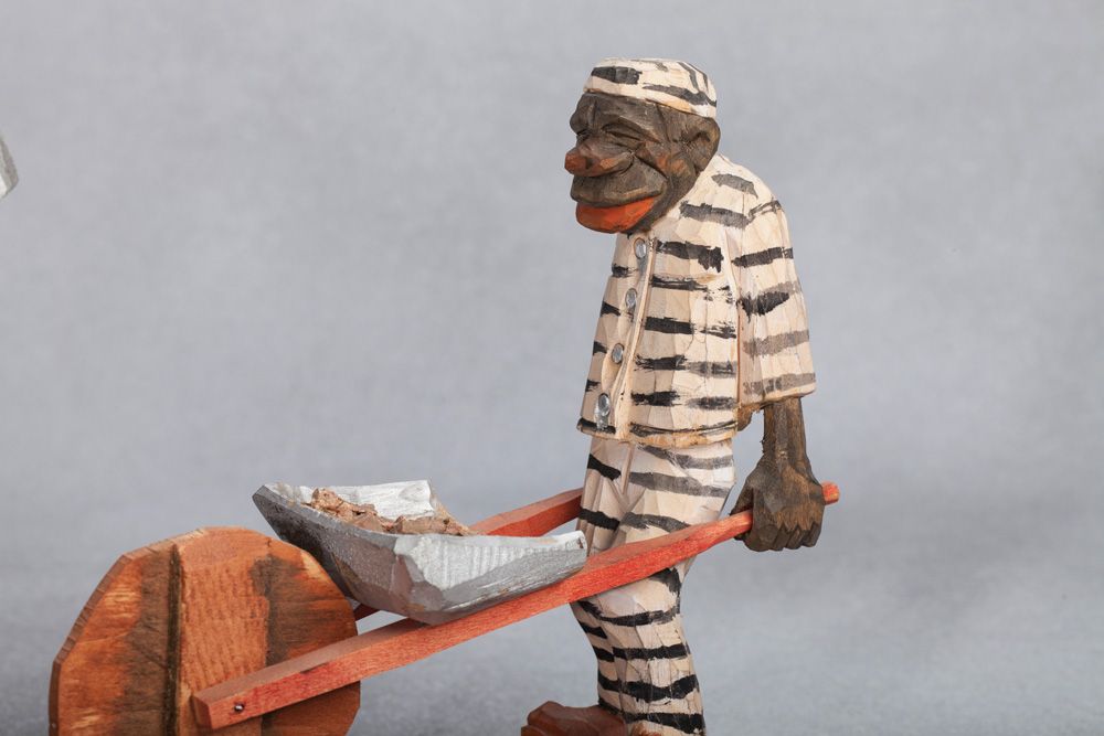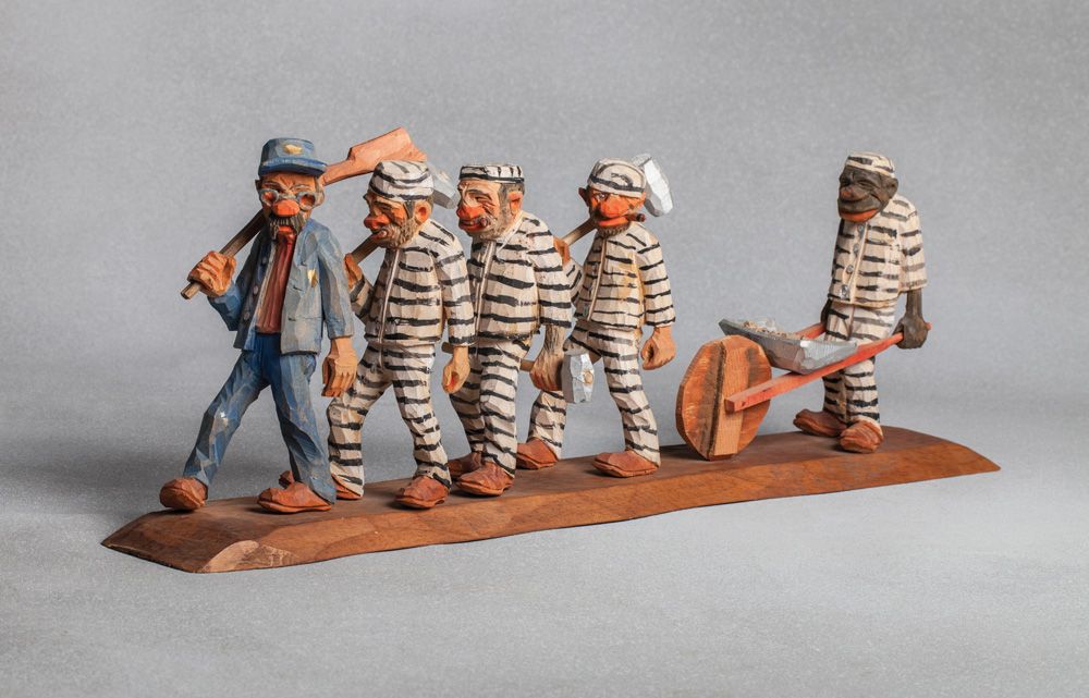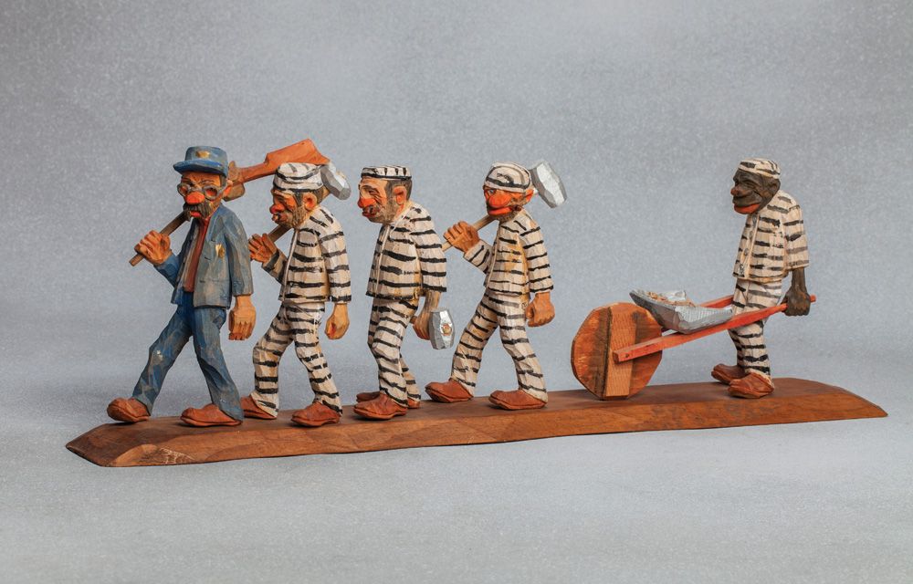 Andy Anderson (1893-1963). Wood Carving, "The Chain Gang". Hand carved and painted by the illustrious wood carver. Four prisoners in striped garb breaking up rocks in the hot sun with their prison guard wielding his shotgun. Four of the five pieces signed "Andy" and "Andy Tesuque NM 1948" under the base. 29" x 10", circa 1940s, fine condition.