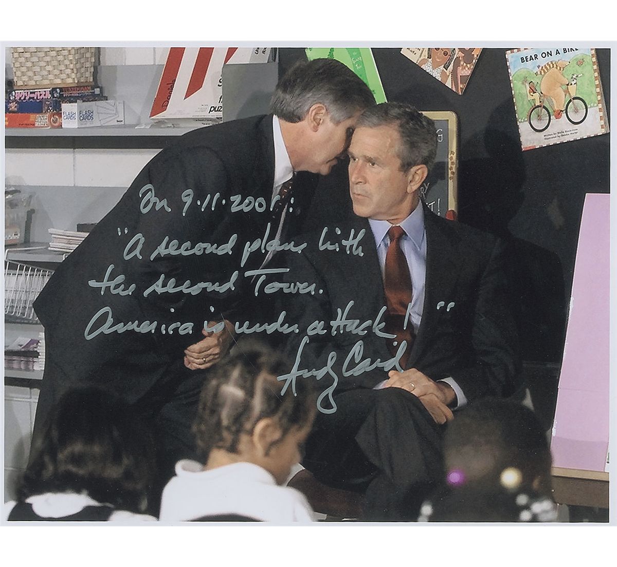 Former White House Cabinet member and Chief of Staff to President George W. Bush. Color satin-finish 14 x 11 photo of Card informing President Bush of the terrorist attacks on the World Trade Center, signed in silver ink, “On 9-11-2001: ‘A second plane hit the second Tower. America is under attack!’ Andy Card.” In fine condition.