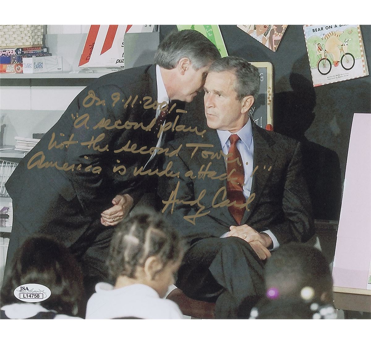 Former White House Cabinet member and Chief of Staff to President George W. Bush. Color satin-finish 10 x 8 photo of Card informing President Bush of the terrorist attacks on the World Trade Center, signed and inscribed in gold ink, “On 9-11-2001—‘A second plane hit the second tower. America is under attack!’ Andy Card.” In very fine condition, with a JSA label affixed to the lower left. Accompanied by a photo taken at time of signing as well as a certificate of authenticity from James Spence.