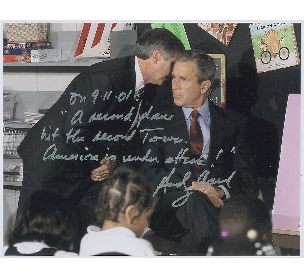 Former White House Cabinet member and Chief of Staff to President George W. Bush. Color satin-finish 14 x 11 photo of Card informing President Bush of the terrorist attacks on the World Trade Center, signed and inscribed in silver ink, “On 9-11-01: ‘A second plane hit the second tower. America is under attack!’ Andy Card.” A JSA label is affixed to the reverse. In very fine condition. Accompanied by a photo taken at time of signing as well as a certificate of authenticity from James Spence.