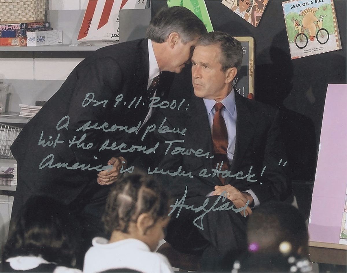 Color glossy 14 x 11 photo of Card informing President Bush of the terrorist attacks on the World Trade Center, signed in silver ink, “On 9-11-2001: ‘A second plane hit the second Tower. America is under attack!’ Andy Card.” In fine condition, with a JSA label affixed to the reverse. Accompanied by a certificate of authenticity from JSA.