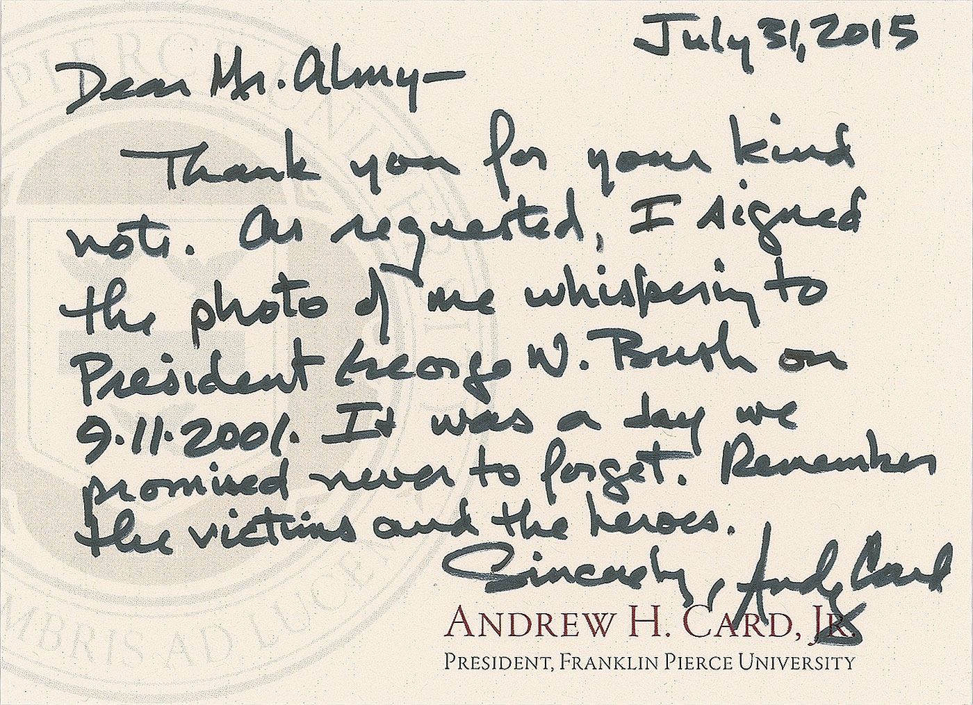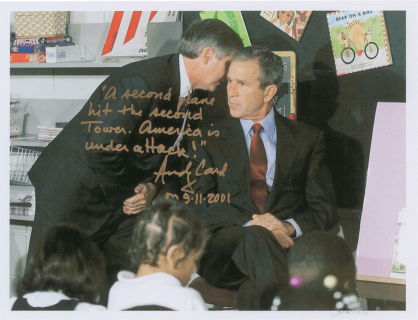 Two items: an ALS signed "Andy Card," one page, 7 x 5 July 31, 2015, personal stationery card, in full: "Thank you for your kind note. As requested, I signed the photo of me whispering to President George W. Bush on 9.11.2001. It was a day we promised never to forget. Remember the victims and the heroes"; and a color 11 x 8.5 heavy paperstock photo of Card informing President Bush of the terrorist attacks on the World Trade Center, signed in gold ink, "'A second plane hit the second Tower. America is under attack!' Andy Card, on 9.11.2001." In overall very fine condition.