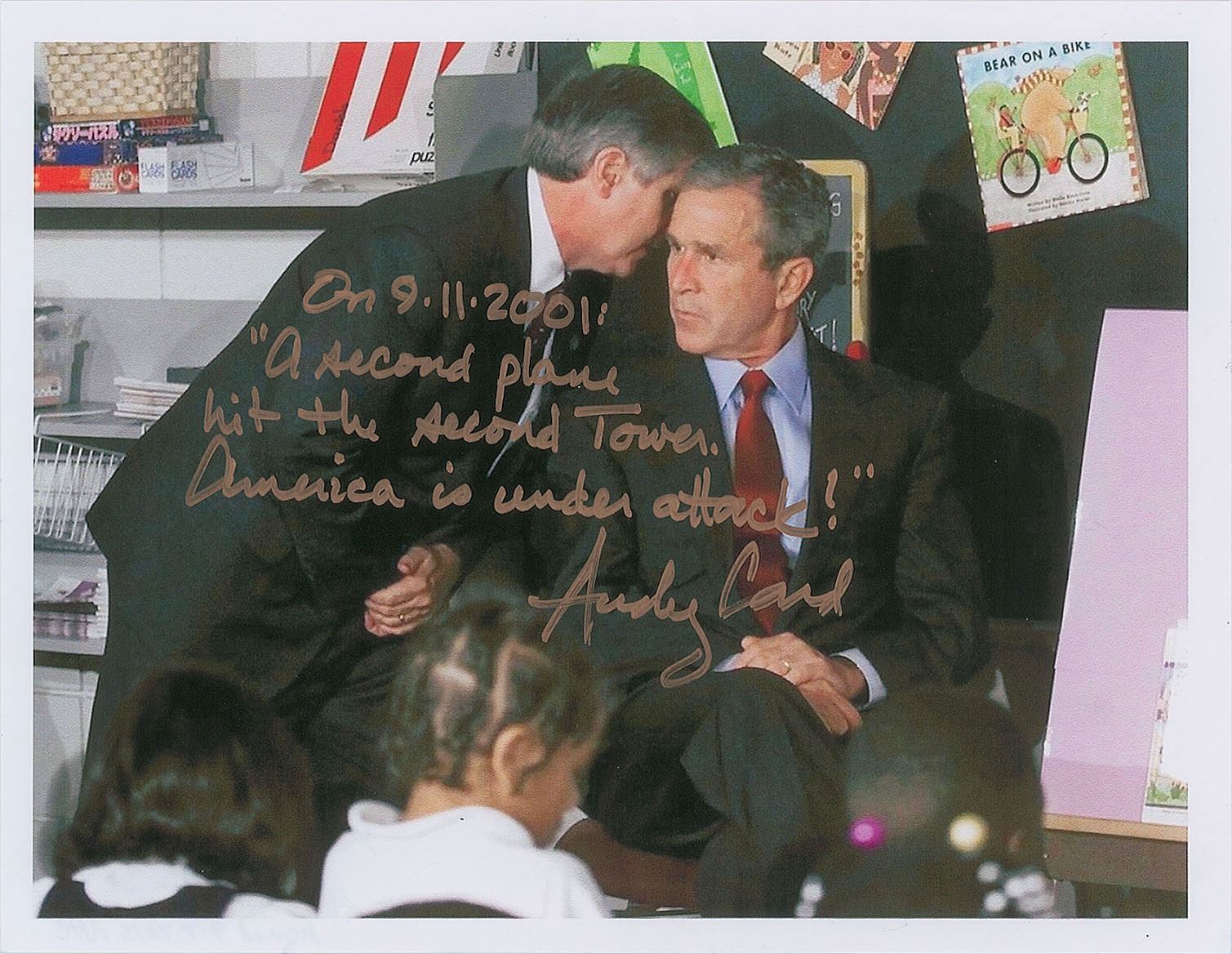 Color 11 x 8.5 laserprint photo of Card informing President Bush of the terrorist attacks on the World Trade Center, signed in bronze ink, "On 9.11.2001: 'A second plane hit the second Tower. America is under attack!' Andy Card." In very fine condition.