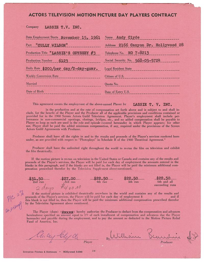 Actor (1892–1967) whose career spanned more than four decades. DS, one page, 8.5 x 11, circa November 1961. Clyde signs a standard Actors Television Motion Picture Day Players Contract to appear as ‘Cully Wilson’ on Lassie at a rate of $200 a day. In part: “This agreement covers the employment of the above-named Player by Lassie T. V. Inc. in the production and at the rate of compensation set forth above.” Handling wear, chipped upper right corner, and staple holes along the bottom of the page, otherwise in fine condition.