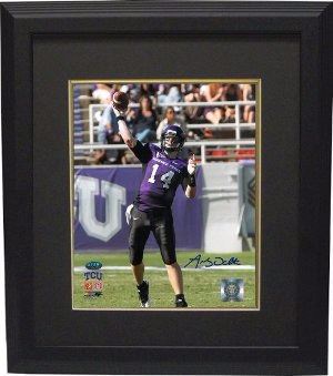 On September 4, 2010, Andy Dalton recorded his 30th victory as the Horned Frogs starting quarterback, passing Sammy Baugh as TCU's all-time win leader. Against Baylor, Dalton completed 21 of 23 pass attempts for 267 yards and two touchdowns, and was named the Mountain West Offensive Player of the Week. On January 1, 2011, Dalton, who completed 194 of 293 passes for 2638 yards for 26 touchdowns during his senior season, led his team to a victory in the Rose Bowl in Pasadena, California. On April 29, 2011, Andy Dalton was selected by the Cincinnati Bengals with the third pick of the second round of the 2011 NFL Draft. Andy Dalton has hand signed this TCU Horned Frogs 8x10 Photo. Dalton Hologram and Certificate of Authenticity from Athlon Sports. Custom Black Mat and Premium Black Color Frame.
