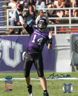 On September 4, 2010, Andy Dalton recorded his 30th victory as the Horned Frogs starting quarterback, passing Sammy Baugh as TCU's all-time win leader. Against Baylor, Dalton completed 21 of 23 pass attempts for 267 yards and two touchdowns, and was named the Mountain West Offensive Player of the Week. On January 1, 2011, Dalton, who completed 194 of 293 passes for 2638 yards for 26 touchdowns during his senior season, led his team to a victory in the Rose Bowl in Pasadena, California. On April 29, 2011, Andy Dalton was selected by the Cincinnati Bengals with the third pick of the second round of the 2011 NFL Draft. Andy Dalton has hand signed this TCU Horned Frogs 8x10 Photo. Dalton Hologram and Certificate of Authenticity from Athlon Sports.