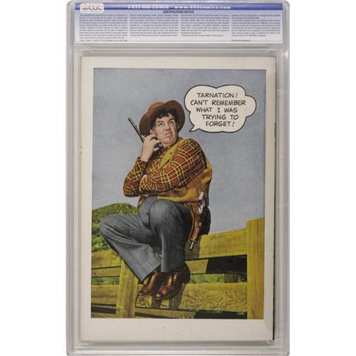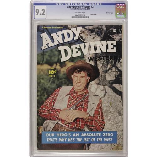 <B>Andy Devine Western #2 Crowley Copy pedigree (Fawcett, 1951) CGC NM- 9.2 Off-white to white pages.</B></I> Andy Devine, the "Jest of the West," is featured on the photo cover of this book. This copy is the only one certified by CGC to date, and the first we've ever had the privilege to offer. Overstreet 2006 NM- 9.2 value = $575. CGC census 10/06: 1 in 9.2, none higher.<BR><BR><b>Shipping:</b> Slabbed Comic (<a target="_blank" href="http://www.heritageauctions.com/common/shipping.php">view shipping information</a>)