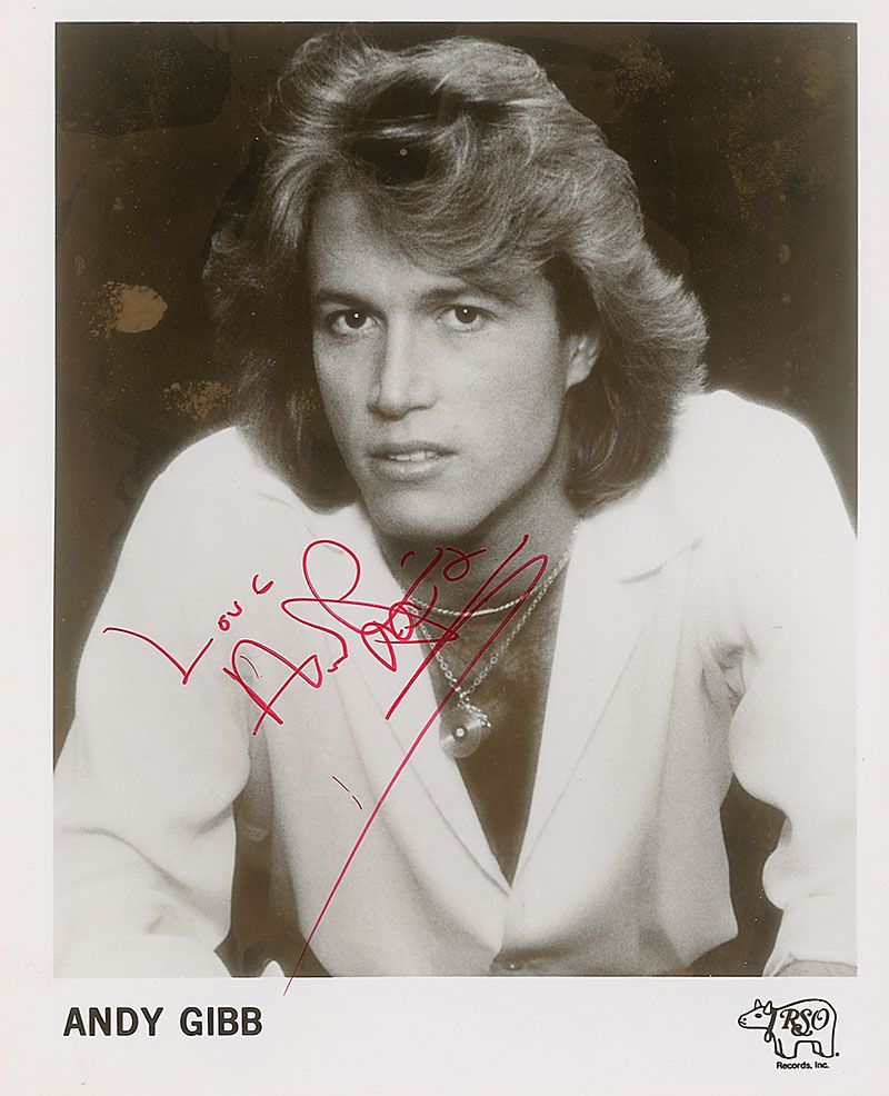 Youngest of the famed musical Gibb Brothers (1958–1988) who enjoyed much success as a teen idol in the 1970s and 1980s before his death at the age of 30 from a heart condition aggravated by heavy drug use. Glossy 8 x 10 RSO Records publicity photo, signed in red felt tip, “Love, Andy Gibb.” In fine condition.
