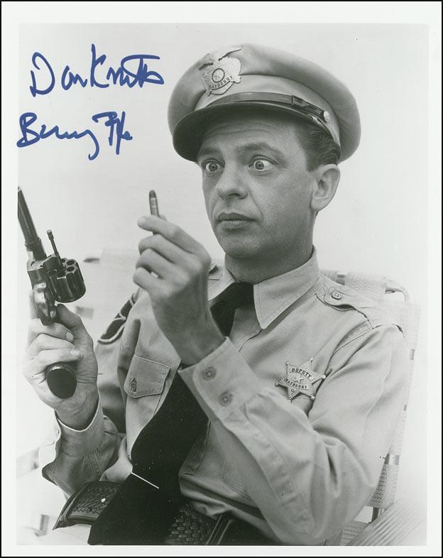 Glossy 8 x 10 photo of Barney Fife attempting to load his revolver, signed in blue felt tip, “Don Knotts, Barney Fife.” In very fine condition.