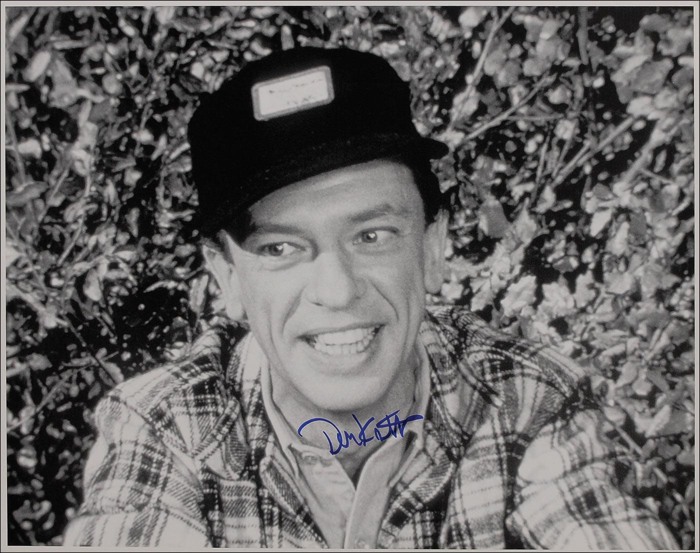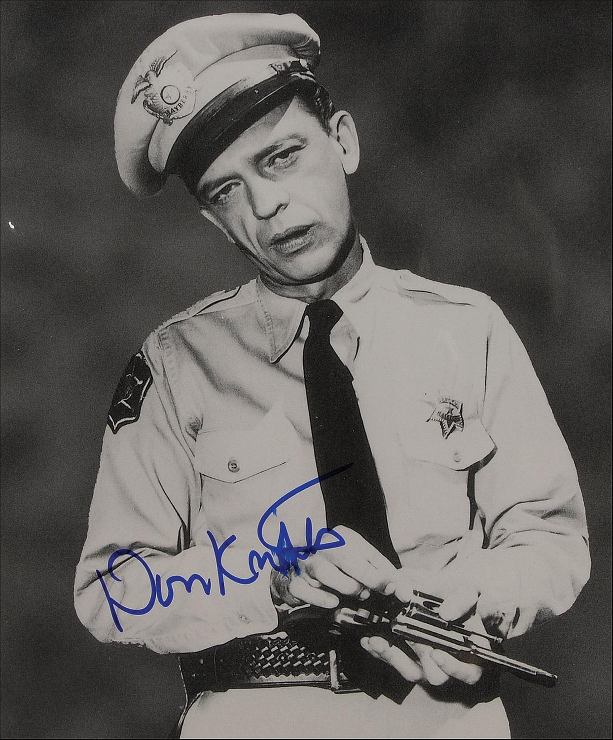 Two items: paperstock 14 x 11 composite photo of Knotts as Deputy Barney Fife with a ‘biography’ of the character and replica Mayberry deputy patch, signed in blue felt tip “Don Knotts”; and a cardstock 14 x 11 photo of Fife in hunting gear also signed in blue felt tip. In fine condition with a corner crease to the first photo and some surface impressions. Accompanied by two photos taken during the signing.