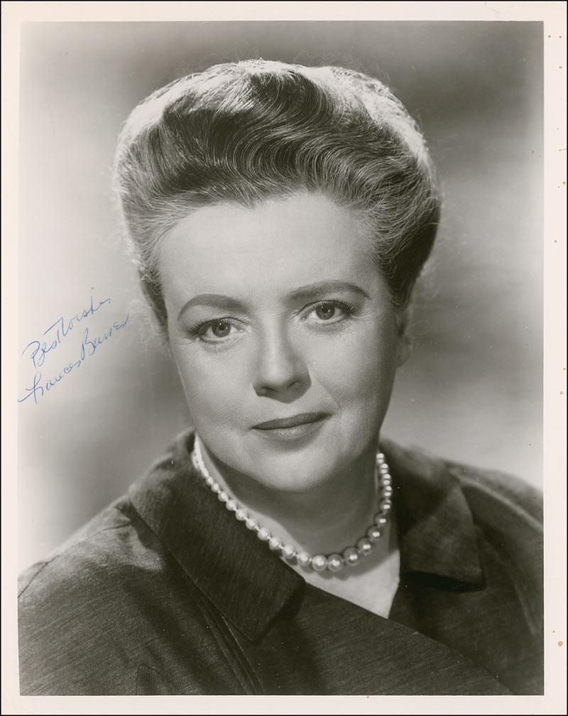 Vintage glossy 8 x 10 photo of Bavier looking matronly in her dress and pearls, signed in blue ballpoint “Best Wishes, Frances Bavier.” In fine condition, with a few small creases and spots of soiling along the edges.
