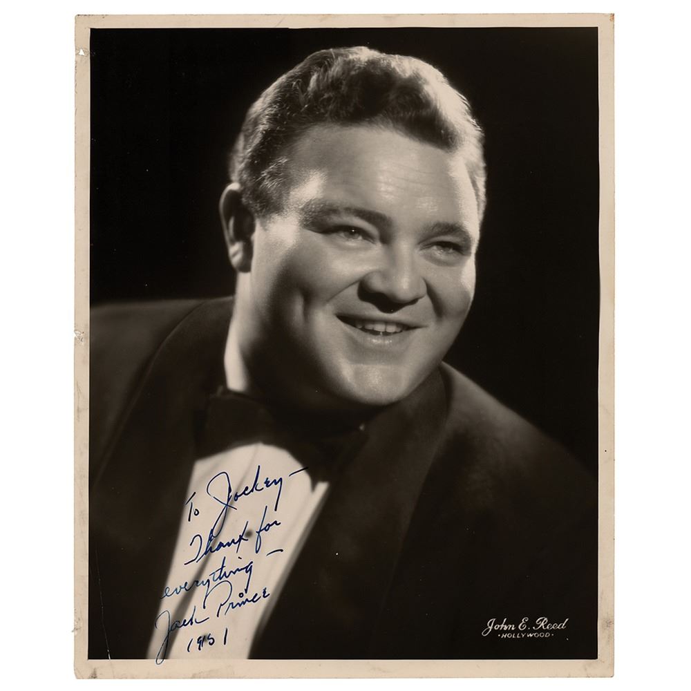 Desirable vintage glossy 8 x 10 John E. Reed of Hollywood photo of Prince in a bust-length pose wearing a tuxedo, signed and inscribed in fountain pen, "To Jockey—Thank you for everything—Jack Prince, 1951.†In very good to fine condition, with a small area of emulsion irregularity, and binder dings and creases to the left edge.