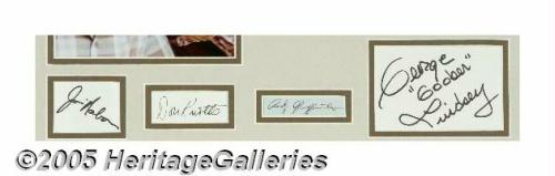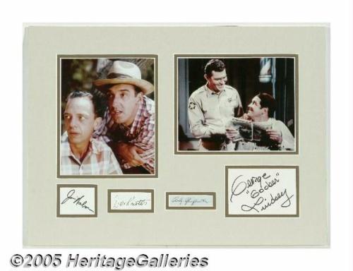 <B>"Andy Griffith Show" Signatures.</B></I> Signature samples from "Andy Griffith Show" co-stars Andy Griffith, Don Knotts, Jim Nabors, and George "Goober" Lindsey, matted along with two 5" x 7" color photos of the actors. <I>With COA from PSA/DNA.</B></I>